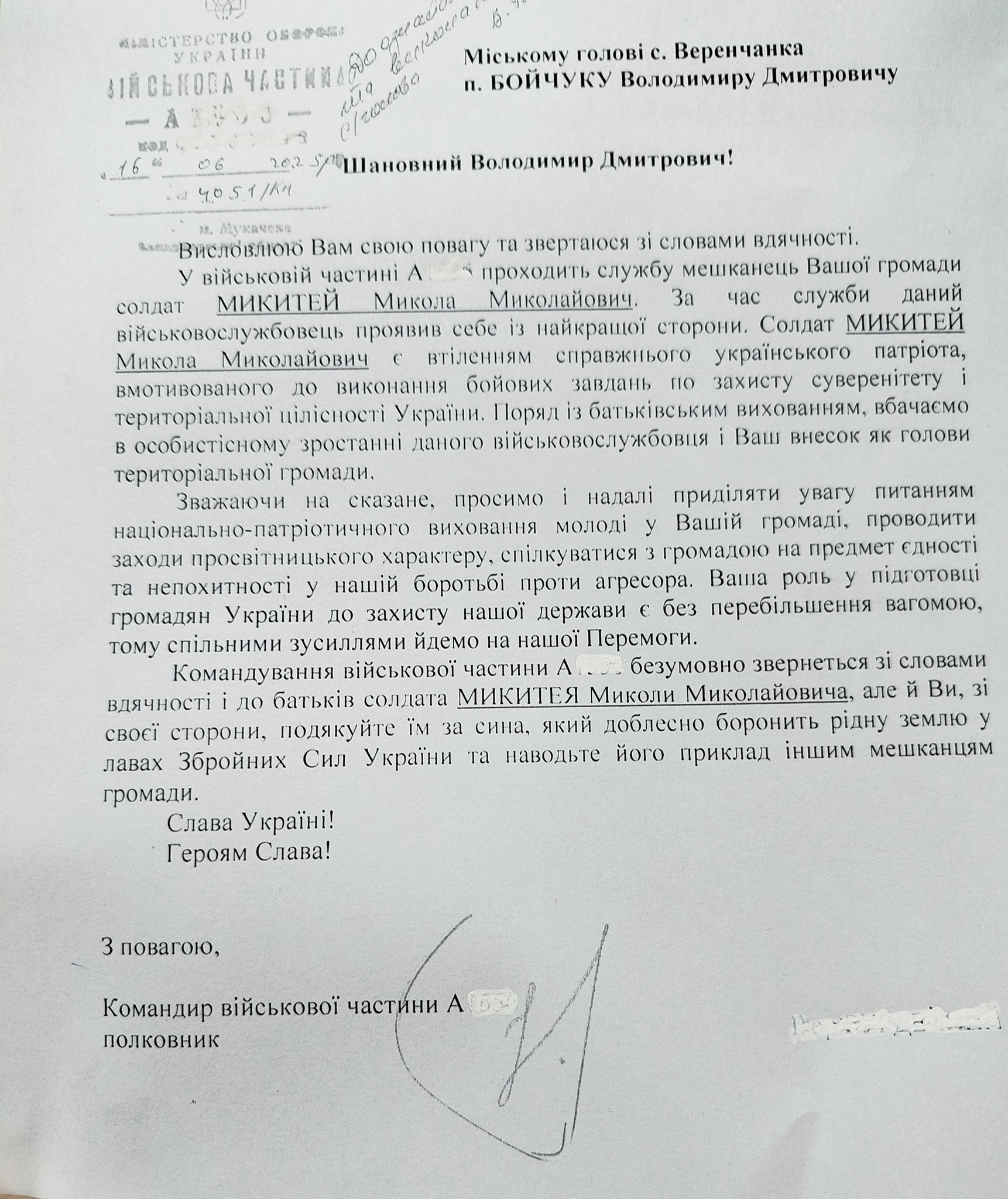 Дуже приємно отримувати такі щирі листи, адже коли в руки потрапляє лист подяки від командира — сльози виступають на очах від гордості та вдячності. Це не просто слова на папері — це глибоке визнання наших Героїв-захисників, бо вони заслуговують на найвищу пошану та всебічну підтримку військових. Голова Веренчанської територіальної громади Бойчук Володимир Дмитрович, депутатський склад та виконавчий комітет Веренчанської сільської ради щиро дякують Миколі Микитей та всім захисникам за їхню сміливість, мужність, невтомну працю, відданість і відвагу. Нехай всі захисники якнайшвидше повернуться до своїх рідних живими та здоровими з перемогою України! Ця подяка військовим – це наш спільний вияв поваги та віри у перемогу.