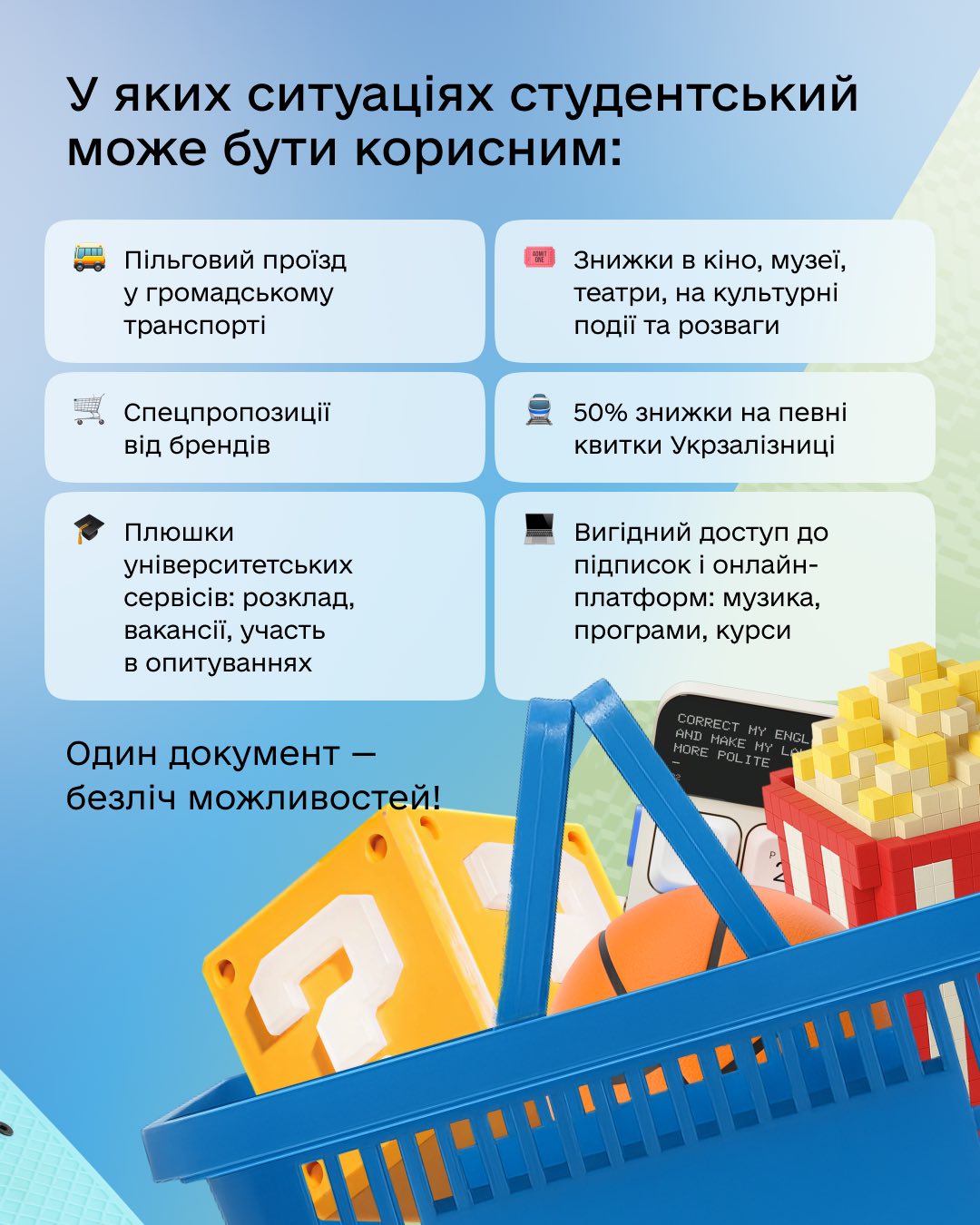 Ваш цифровий студентський квиток у “Дії” можна легко поширювати для заповнення анкет, подання заяв або реєстрації на різноманітні події. Крім того, це повноцінний документ, що посвідчує вашу особу, і його можна використовувати під час подорожей Україною 🧳, замінюючи традиційний пластиковий документ.