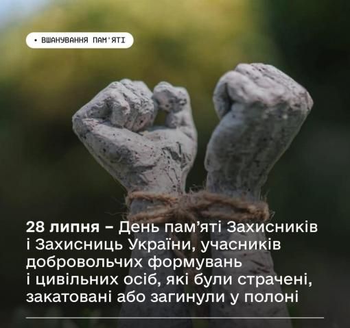 Верховна Рада України встановила 28 липня Днем вшанування пам’яті Захисників і Захисниць України, учасників добровольчих формувань, а також цивільних осіб, страчених, закатованих або загиблих у полоні. Цей день відзначатиметься щорічно. Ми вшановуємо подвиг та віддаємо шану всім, хто боровся за свободу та незалежність України, особливо тим, хто став жертвою жорстокої агресії та загинув у ворожому полоні. Ця дата обрана не випадково. У ніч з 28 на 29 липня 2022 року стався жахливий воєнний злочин: обстріл Волноваської колонії поблизу окупованої Оленівки. Внаслідок цього теракту загинули щонайменше 53 українські полонені, які утримувалися після оборони «Азовсталі». Понад 130 захисників отримали поранення різного ступеня тяжкості. Кожна хвилина мовчання – це тисячі імен, які назавжди залишаться в нашій пам’яті. Ми пам’ятаємо всіх українських військовослужбовців, учасників добровольчих формувань та цивільних осіб, які загинули, захищаючи суверенітет і територіальну цілісність України. Їхня жертва є найвищим актом патріотизму. Наш обов’язок – пам’ятати про їхній подвиг та боротьбу проти жорстокого насильства під час російської збройної агресії. Вічна пам’ять героям!