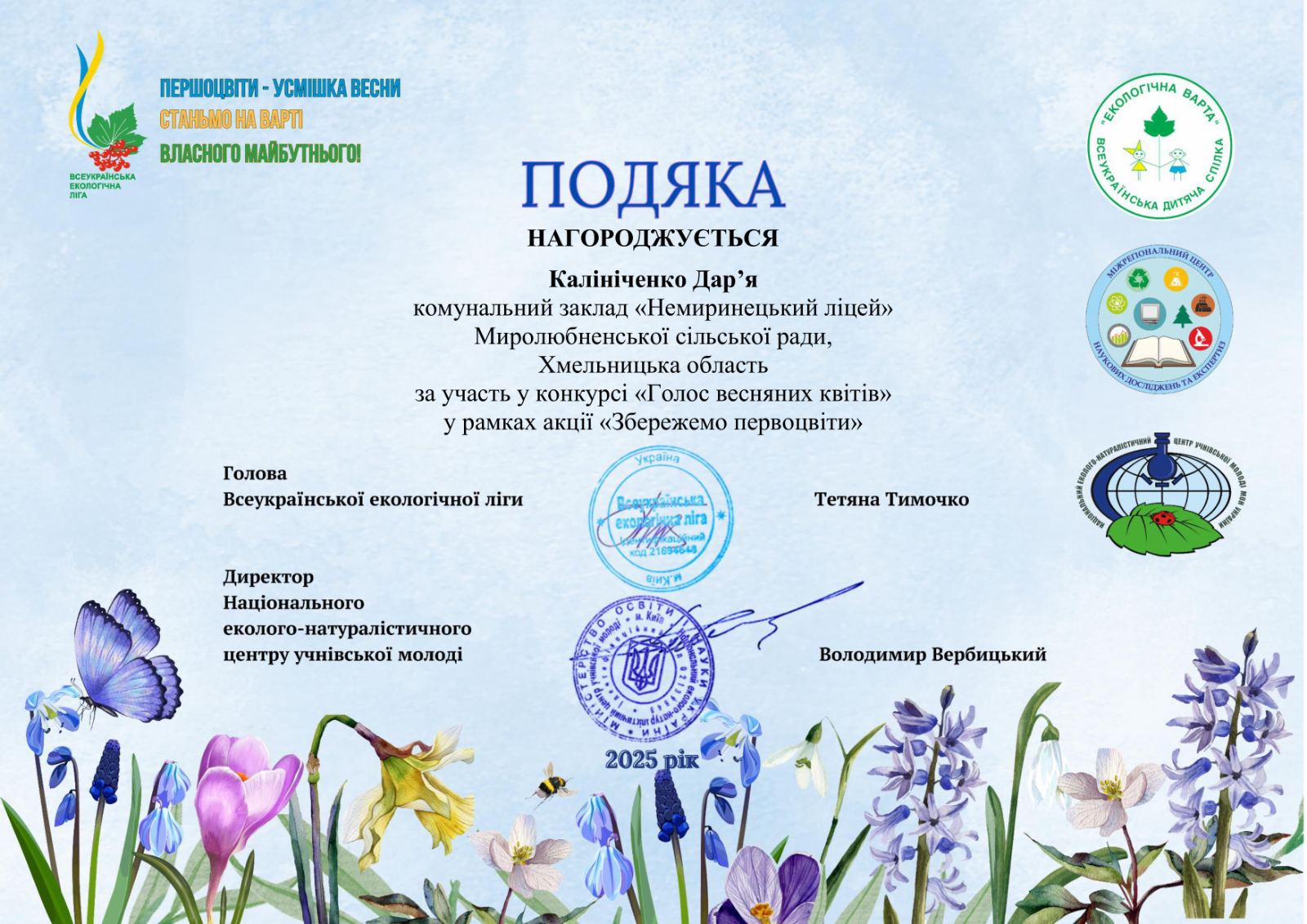 Цьогоріч участь в акції взяли й учні Немиринецького ліцею – Матвій Калініченко (9 клас) та Дар’я Калініченко (10 клас). Діти під керівництвом Алли Березовської (учителька інтегрованого курсу ” Мистецтво”) та Оксани Шпаченко (педагог-організатор) зняли мотиваційний відеоролик “НЕ ЗРИВАЙ – БЕРЕЖИ” і отримали ПОДЯКИ від Національного еколого-натуралістичного центру учнівської молоді МОН України та Всеукраїнської дитячої спілки “Екологічна варта”. Важливо берегти первоцвіти, адже вони є символом весни та краси нашої природи. Збереження первоцвітів – це наш внесок у майбутнє України.