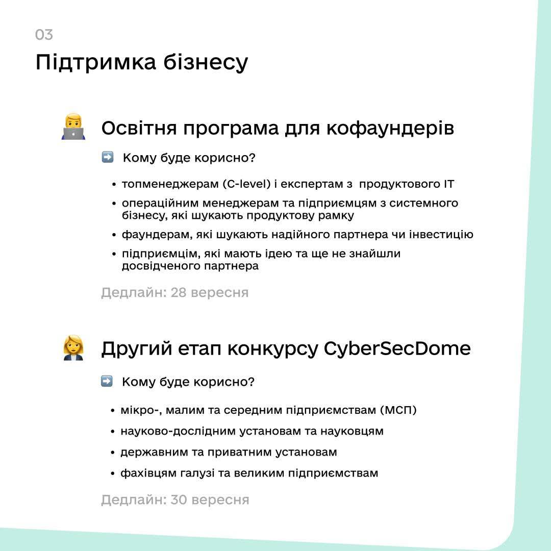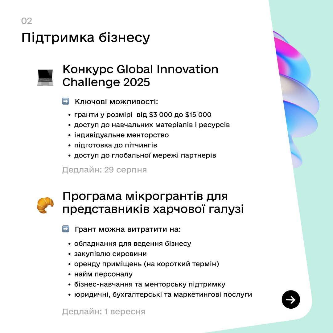 🔹 **Гранти та конкурси з фінансування:** Для підтримки інноваційних проєктів, стартапів та розширення існуючого бізнесу регулярно оголошуються грантові програми та конкурси. Ці можливості фінансування від державних та міжнародних фондів можуть стати вирішальними для запуску нових продуктів, виходу на нові ринки або модернізації виробництва. Платформа Дія.Бізнес регулярно оновлює інформацію про актуальні конкурси та умови участі.