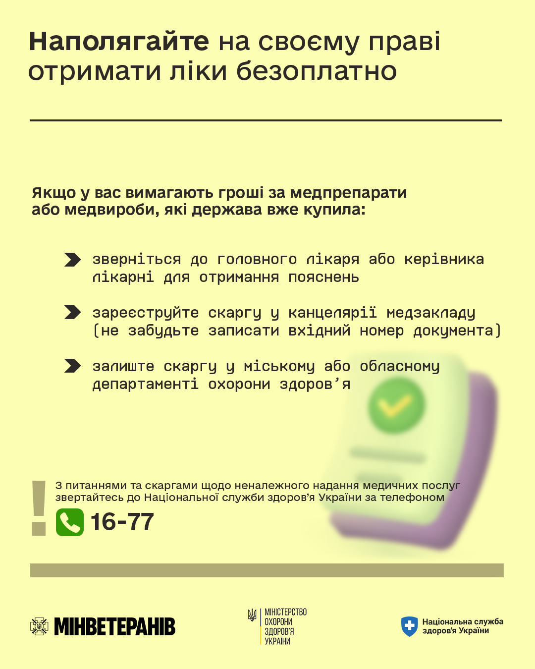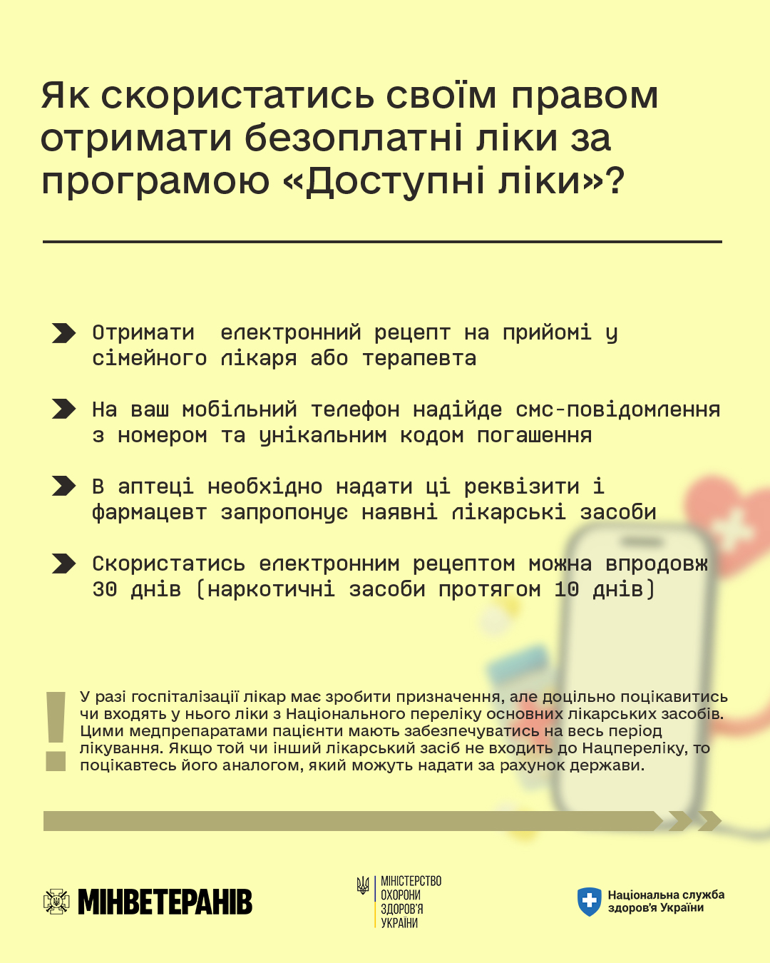 ❗Звертаємо вашу увагу, що держава забезпечує медикаментами для ветеранів та медичними виробами у разі стаціонарного або амбулаторного лікування у закладах, законтрактованих НСЗУ. Важливо переконатися, що медичний заклад співпрацює з НСЗУ, щоб отримати доступ до необхідних ліків.