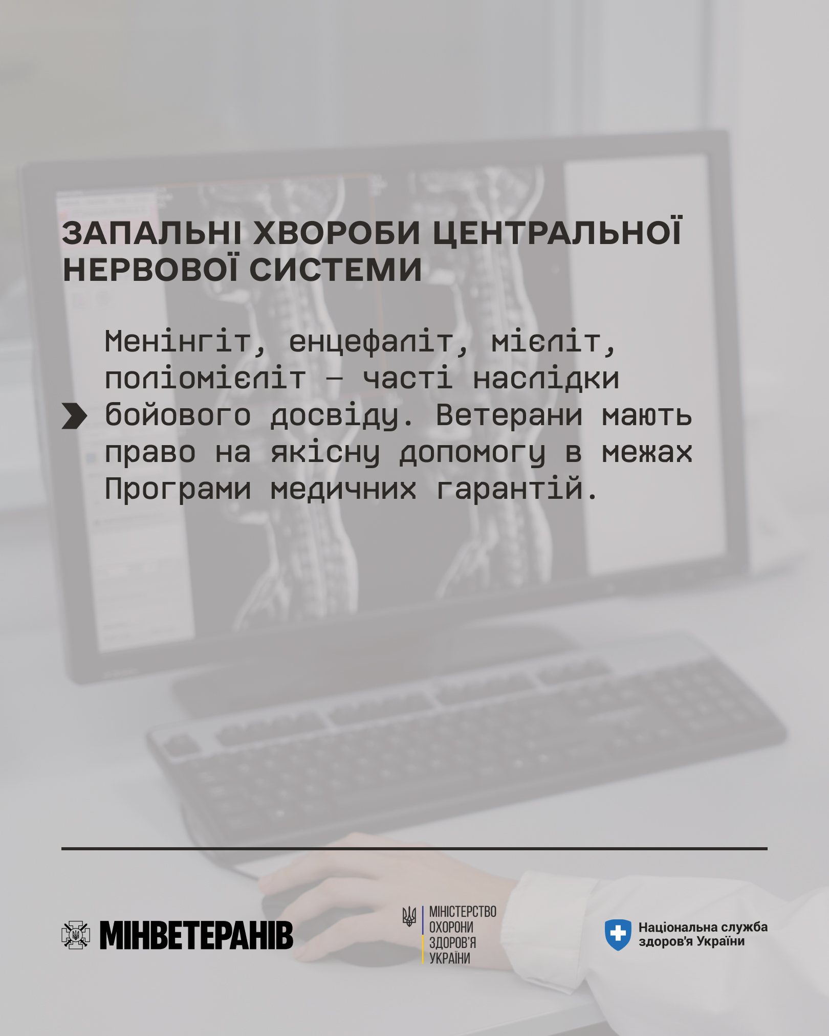 Які послуги надаються безкоштовно? Ветерани можуть скористатися широким спектром медичних послуг, спрямованих на діагностику та лікування запальних захворювань ЦНС. Ці послуги включають консультації фахівців, необхідні обстеження, а також розробку індивідуального плану лікування. Головна умова – звернення до закладів, які мають договір з НСЗУ (Національна служба здоров’я України) на надання відповідної амбулаторної допомоги та мають у штаті кваліфікованих фахівців.