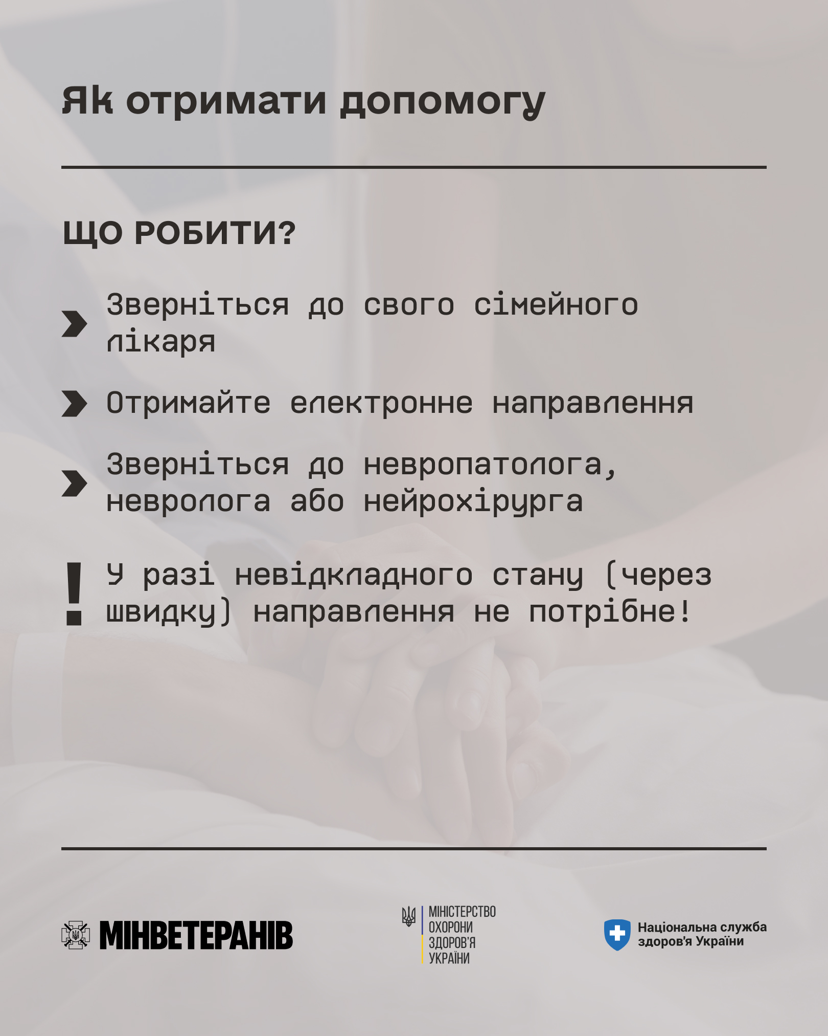 ⚫Хвороби центральної нервової системи входять до переліку найпоширеніших захворювань, які виникають або ускладнюються під час перебування в зоні бойових дій або після повернення до мирного життя. Своєчасна діагностика та якісне лікування є ключовими вимогами для подолання цих захворювань. Ветерани та ветеранки мають можливість отримати ці медичні послуги безоплатно.
