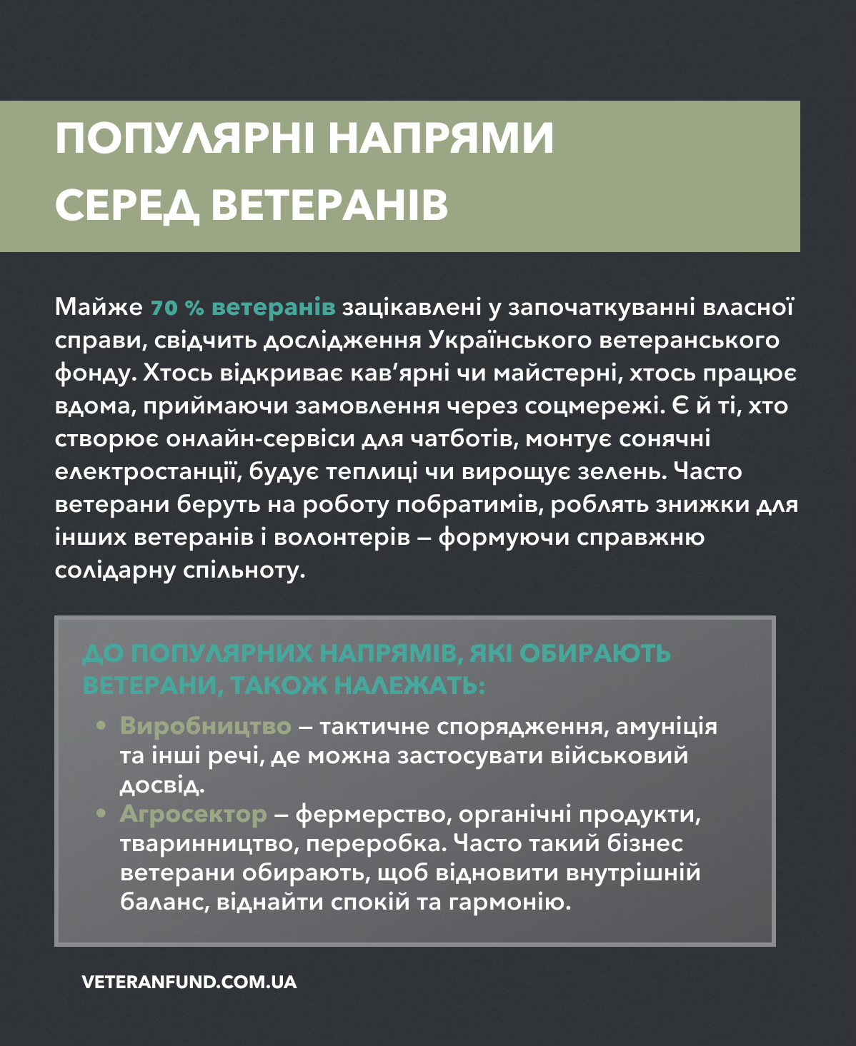 🔗Детальніше — у нашому відеокурсі “Працевлаштування під час служби”. З курсу ви дізнаєтеся, як визначити свої сильні сторони після демобілізації, як обрати професію, яка дійсно буде до душі, як скласти ідеальне сучасне резюме та підготуватися до співбесіди. Лекторка — Анна-Марія Сабов, незалежна HR та карʼєрна консультантка, HR Influencer 2024. Щоб отриматит доступ — реєструйтеся на платформі “Карʼєра ветерана”: https://work.veteranfund.com.ua/