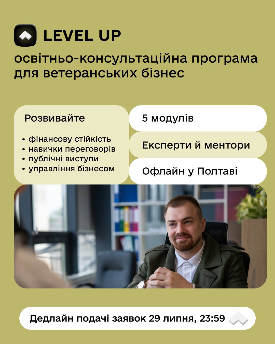 📣 Розпочато набір на унікальну програму “Level UP” – комплексний освітньо-консультаційний проєкт, розроблений спеціально для ветеранів, ветеранок та членів їхніх сімей, які прагнуть розвивати власний бізнес. Ця ініціатива спрямована на посилення фінансової стійкості, вдосконалення навичок ведення переговорів, покращення публічних виступів та ефективне управління бізнесом.