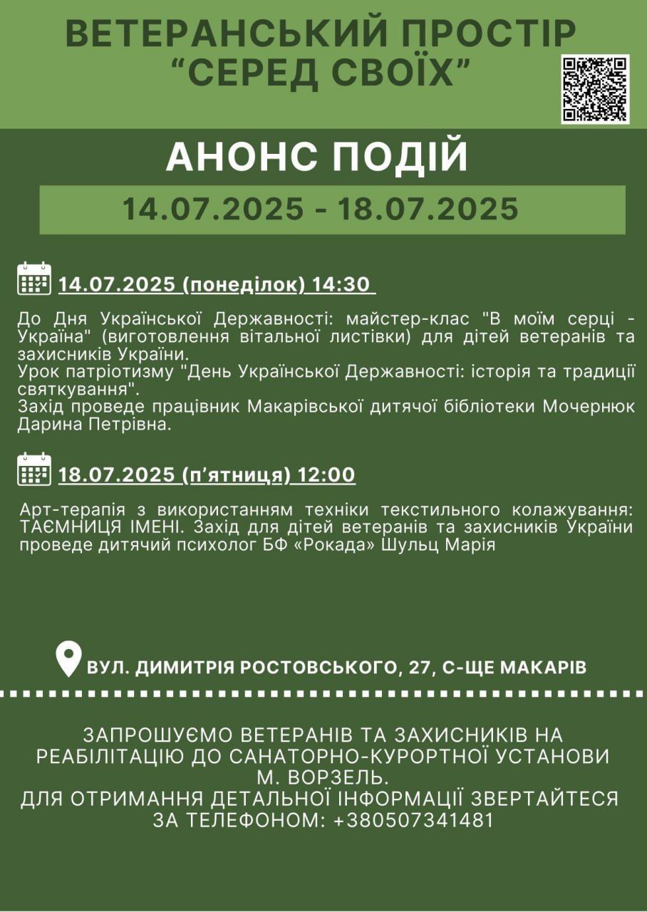 Ветеранський простір “Серед Своїх” у селищі Макарів, розташований за адресою вул. Димитрія Ростовського, 27, продовжує свою благородну місію з надання всебічної підтримки ветеранам та їхнім родинам. Ми раді анонсувати серію важливих заходів, які відбудуться з 14 по 18 липня 2025 року, а також нагадати про унікальні можливості для реабілітації. Наша ініціатива спрямована на створення міцної спільноти та забезпечення належної уваги до потреб тих, хто віддав найцінніше заради захисту України. Простір “Серед Своїх” розроблений як безпечне та сприятливе середовище, де діти ветеранів та захисників України можуть знайти розраду, розвинути свої таланти та дізнатися більше про історію своєї країни. Ми віримо, що підтримка ветеранів починається з турботи про їхніх нащадків, забезпечуючи їм світле та впевнене майбутнє. Анонс подій для дітей ветеранів та захисників України: 🔹 14 липня (понеділок), 14:30 Цей день буде повністю присвячений святкуванню Дня Української Державності – важливого свята, що вшановує багатовікову історію українського державотворення. Для юних відвідувачів пропонуємо: Майстер-клас «В моїм серці – Україна» (виготовлення вітальної листівки). Діти матимуть змогу проявити свою творчість, створюючи унікальні листівки, наповнені патріотичним духом. Це не тільки розвиває дрібну моторику та уяву, а й допомагає усвідомити важливість національної символіки. Урок патріотизму: «День Української Державності: історія та традиції святкування». Через інтерактивні заняття діти дізнаються про ключові моменти становлення української державності, її героїв та традиції, що передаються з покоління в покоління. Такий підхід сприяє формуванню глибоких знань та поваги до національної спадщини. 🔹 18 липня (п’ятниця), 12:00 Цей день буде присвячений арт-терапевтичній практиці, яка є важливою складовою психологічної підтримки ветеранів та їхніх сімей. Ми запрошуємо дітей зануритися у світ мистецтва: Арт-терапія «Таємниця імені» (техніка текстильного колажування). Це унікальна можливість для самовираження через творчість. Техніка текстильного колажування дозволяє дітям досліджувати свої емоції та внутрішній світ, створюючи особливі арт-об’єкти, пов’язані з їхнім іменем та особистістю. Арт-терапія сприяє зниженню стресу, покращенню емоційного стану та розвитку комунікативних навичок. Окрім заходів для дітей, Ветеранський простір ‘Серед Своїх’ активно організовує програми для безпосередньої підтримки ветеранів та захисників України. Ми розуміємо, наскільки важливою є повна та якісна реабілітація після повернення до мирного життя. Запрошення на реабілітацію до санаторно-курортної установи: Ми щиро запрошуємо ветеранів та захисників України скористатися можливістю пройти повноцінний курс реабілітації у комфортабельній санаторно-курортній установі в мальовничому місті Ворзель. Ця програма розроблена для відновлення фізичного та психологічного здоров’я, адаптації до цивільного життя та підвищення загальної якості життя. Професійні фахівці допоможуть відновити сили та знайти внутрішню гармонію. Це є ключовим елементом нашої програми підтримки ветеранів. Для отримання детальної інформації щодо програм реабілітації та участі у заходах для дітей, будь ласка, звертайтесь за телефоном: +38 (050) 734-14-81. Команда ‘Серед Своїх