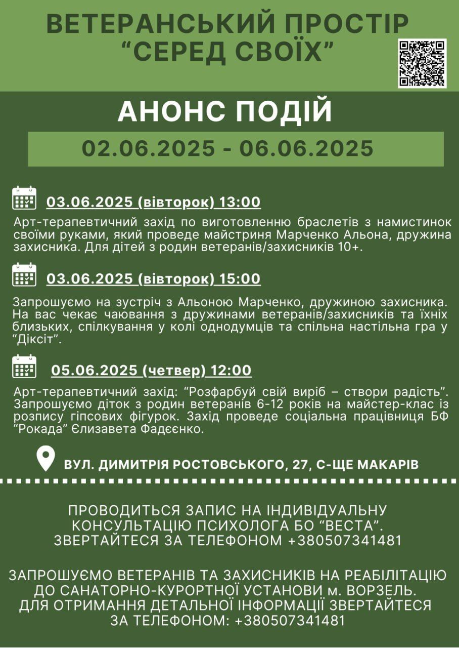 Запрошуємо до ветеранського простору “СЕРЕД СВОЇХ”, де завжди панує атмосфера підтримки та взаєморозуміння! Тут кожен знайде щось для себе, від творчих майстер-класів до теплих зустрічей у колі однодумців. Наш простір розташований за адресою: 📍 вул. Димитрія Ростовського, 27, с-ще Макарів.