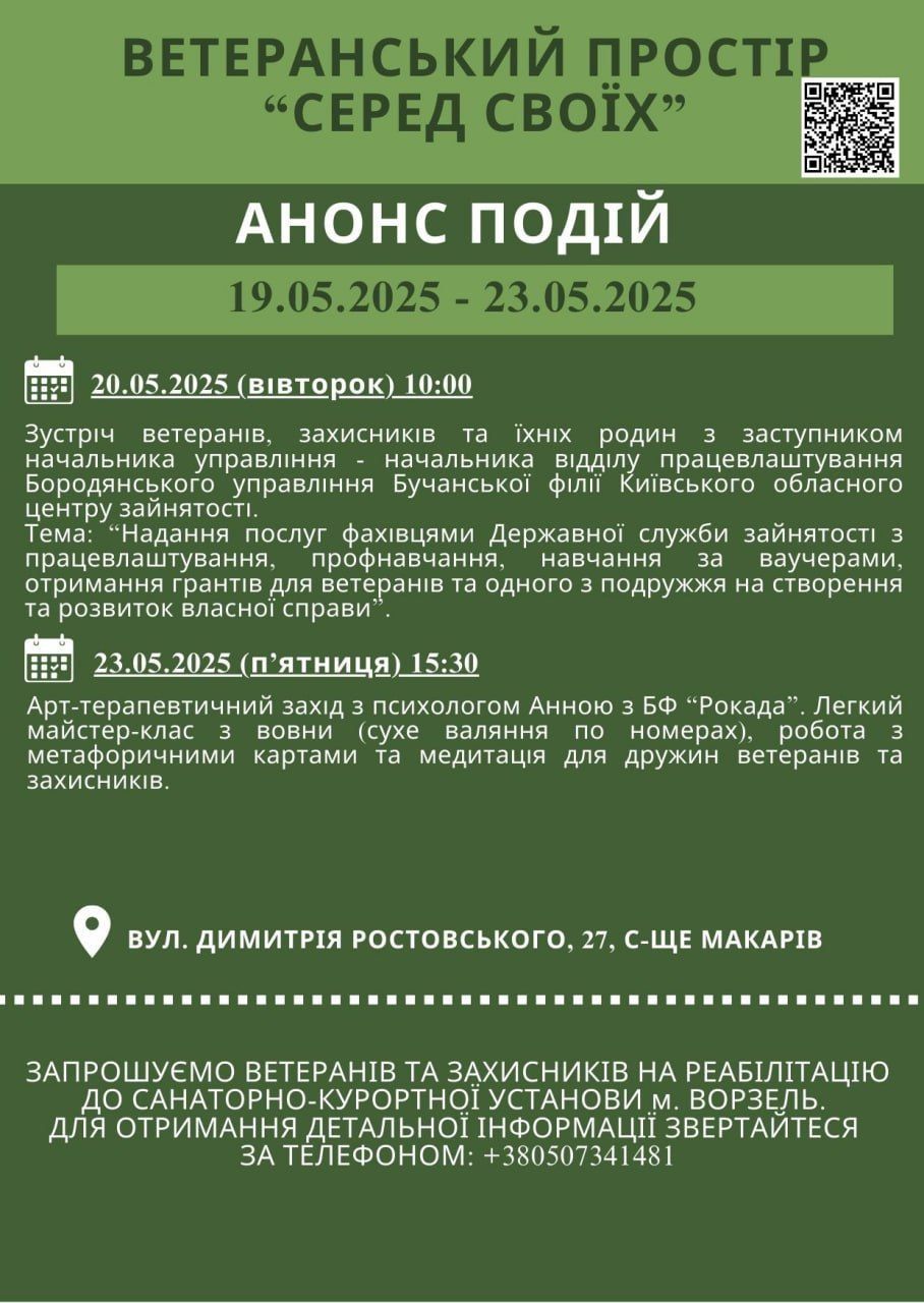Запрошуємо ветеранів, захисників України та членів їхніх родин на заходи, які відбудуться з 19 по 23 травня 2025 року у ветеранському просторі, що знаходиться за адресою: вул. Димитрія Ростовського, 27, с-ще Макарів. Ці заходи спрямовані на всебічну підтримку, розвиток та відновлення наших героїв.