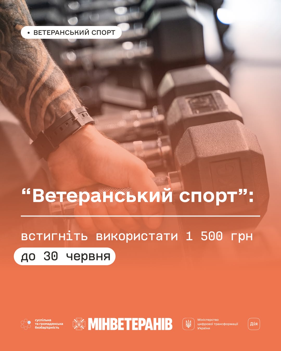 Ветеранський спорт: Важлива ініціатива для підтримки захисників України. Не пропустіть можливість використати 1500 гривень на спортивні активності до 30 червня! Ця програма створена для того, щоб наші ветерани та ветеранки могли активно долучатися до спортивного життя, покращувати своє здоров’я та знаходити нові можливості для реабілітації та інтеграції у мирне життя. Ініціатива «Ветеранський спорт» є ключовим елементом державної політики, спрямованої на підтримку тих, хто захищав нашу країну.Програма надає унікальну можливість використати отримані 1500 гривень на різноманітні спортивні активності. Це може бути відвідування тренажерних залів, басейнів, спортивних секцій чи клубів. Головне – це бажання ветеранів та ветеранок залишатися активними та використовувати всі доступні ресурси для свого благополуччя. Термін дії коштів обмежений – їх необхідно використати до кінця червня, тому не варто зволікати. Ця фінансова підтримка в рамках програми «Ветеранський спорт» є чудовим стимулом для повернення до повноцінного життя через фізичну активність.Де ж можна використати ці кошти, отримані за програмою «Ветеранський спорт»? Ви можете скористатися ними у будь-якому спортивному закладі, який має відповідні МСС-коди: 7941 – “Фізична культура” або 7997 – “Клуби — заміські клуби, членство”. Це забезпечує широкий вибір місць для занять спортом, від великих фітнес-центрів до спеціалізованих спортивних клубів. Щоб полегшити пошук відповідних закладів, Міністерство у справах ветеранів України надало зручний список на своєму офіційному сайті. Завдяки цьому списку, кожен ветеран чи ветеранка зможе швидко знайти найближчий або найзручніший спортивний об’єкт для своїх тренувань. «Ветеранський спорт» – це не просто гроші, це інвестиція у майбутнє наших захисників.Цей важливий проєкт є результатом спільної роботи Міністерства у справах ветеранів України та Міністерства цифрової трансформації України. Його реалізація відбувається в рамках виконання Стратегії ветеранської політики та Національної стратегії зі створення безбар’єрного простору в Україні, ініційованої першою леді України Оленою Зеленською. Метою цих стратегій є створення максимально сприятливих умов для адаптації та розвитку ветеранів, забезпечення їхнього повноцінного життя в суспільстві. «Ветеранський спорт» чудово вписується в цю концепцію, надаючи практичні інструменти для фізичної та психологічної реабілітації.Долучитися до спортивної спільноти ветеранів – це більше, ніж просто зайнятися спортом. Це можливість знайти однодумців, отримати підтримку та відчути себе частиною активної та турботливої спільноти. Регулярні заняття спортом сприяють не лише фізичному відновленню, але й поліпшенню ментального здоров’я, зниженню стресу та підвищенню загальної якості життя. Програма «Ветеранський спорт» відкриває двері для нових можливостей, допомагаючи ветеранам відчути себе сильнішими, впевненішими та більш інтегрованими у суспільство. Кожен ветеран заслуговує на таку підтримку, і ця ініціатива є кроком до створення кращого майбутнього для наших героїв.Не забувайте, що час спливає швидко. Використайте свій шанс до 30 червня, щоб стати частиною ініціативи «Ветеранський спорт». Це ваш внесок у власне здоров’я та добробут. Детальніше про програму та