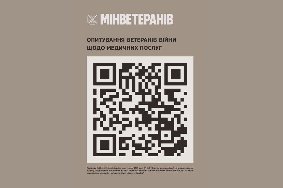✅Ветеранів та ветеранок України запрошують взяти участь у важливому опитуванні, присвяченому оцінці якості медичних послуг, що надаються.Міністерство у справах ветеранів України розпочало масштабне опитування серед усіх ветеранів та ветеранок, аби отримати об’єктивну картину стану надання медичної допомоги. Ця ініціатива є частиною реалізації експериментального проєкту, затвердженого постановою Кабінету Міністрів України від 4 лютого 2025 року № 140. Проєкт спрямований на надання розширених послуг з первинної медичної допомоги для тих, хто мужньо захищав незалежність, суверенітет та територіальну цілісність України.❗️Ваш внесок є надзвичайно важливим. Для того, щоб оцінити реальну ефективність пілотного проєкту та зібрати вичерпну інформацію про потреби ветеранів, Мінветеранів проводить це анонімне опитування. Ваші відповіді допоможуть сформувати майбутнє медичного забезпечення.Основні цілі цього важливого опитування включають:▪️Детальну оцінку рівня обізнаності та загального рівня задоволеності ветеранів наданими медичними послугами.▪️Збір конкретної інформації щодо проблемних аспектів, з якими ветерани стикаються під час звернення за медичною допомогою.▪️Використання зібраних даних для системного вдосконалення та оптимізації усієї системи надання медичних послуг.▶️Пройти опитування можна за посиланням: https://ee-eu.kobotoolbox.org/x/T0Fd3qXOОтримані результати дозволять Мінветеранів не тільки провести об’єктивний моніторинг та оцінку ефективності чинних програм, але й сприятимуть подальшому розвитку та розширенню системи медичних послуг, адаптованих до потреб ветеранів України. Ваша участь – це крок до кращого майбутнього.