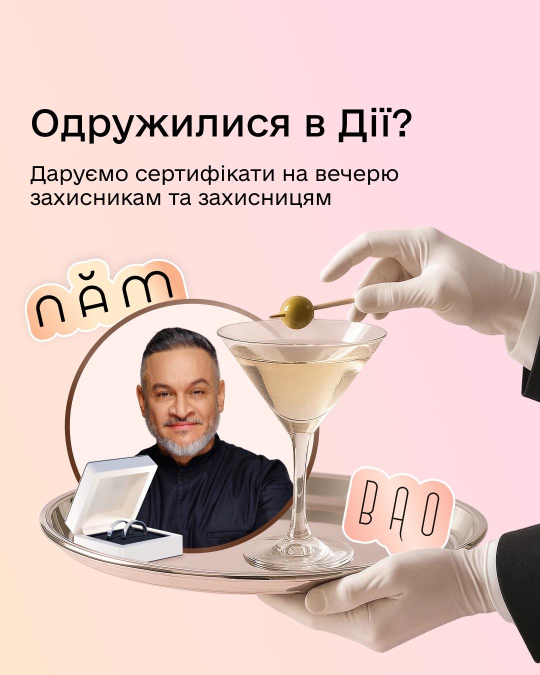 Нагадуємо, що Дія, BAO і NAM об’єдналися, щоб підтримати кохання! Одружіться в Дії та отримайте 3 000 грн від BAO або NAM на незабутню романтичну вечерю для військових 🥂. Це чудовий спосіб відсвяткувати важливу подію у вашому житті.