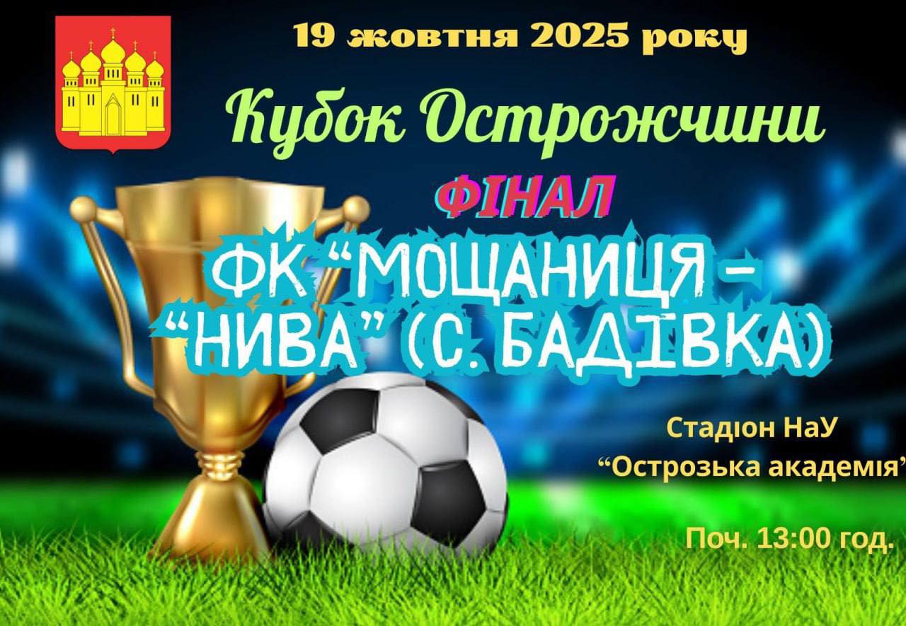 Завтра відбудеться грандіозний фінал щорічного турніру «Кубок Острожчини»! На полі зійдуться дві непереможні команди: футбольний клуб «Мощаниця» та ФК «Нива» із села Бадівка. Це протистояння обіцяє бути надзвичайно напруженим та захоплюючим, адже на кону – почесний трофей.