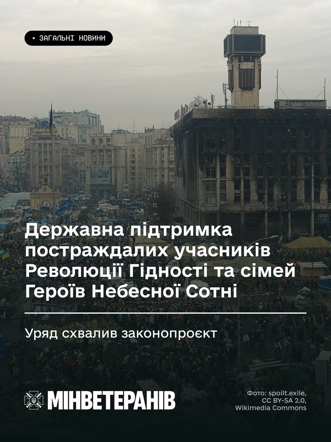 Уряд України схвалив законопроєкт, розроблений Мінветеранів, який спрямований на визнання внеску та надання державної підтримки постраждалим учасникам Революції Гідності, а також сім’ям Героїв Небесної Сотні. Цей законопроєкт покликаний на законодавчому рівні врегулювати правовий статус цих категорій громадян, які відстоювали європейський вибір країни та виступали проти режиму Януковича в період з 21 листопада 2013 року по 21 лютого 2014 року.