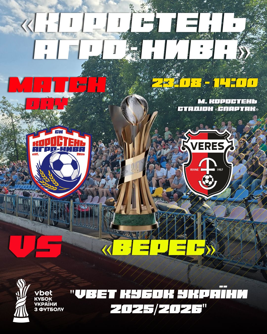 Визначено дату та час кубкового матчу СК Коростень / Агро-Нива — ФК «Верес». Історична подія для коростенського футболу! Стало відомо, коли відбудеться поєдинок 1/32 фіналу VBET Кубка України між СК «Коростень Агро-Нива» та ФК «Верес» з Рівненської області. Ця гра має особливе значення, адже вперше в історії коростенського футболу на місцевому стадіоні «Спартак» пройде офіційний матч, у якому команда з нашого міста зустрінеться з представником Прем’єр-ліги України. Початок цієї захопливої події заплановано на 23 серпня 2025 року, о 14:00. Вболівальники матимуть змогу на власні очі побачити протистояння місцевих талантів з професійним клубом найвищого рівня. Це чудова нагода для розвитку футболу в регіоні та підтримки спортивного духу серед молоді. Ми з нетерпінням чекаємо на цей матч, який, безсумнівно, стане яскравою сторінкою в літописі коростенського спорту. Підтримка рідної команди є надзвичайно важливою, тому закликаємо всіх мешканців та гостей міста прийти на стадіон «Спартак» та створити незабутню атмосферу для наших футболістів. Наближається важлива гра, яка може увійти в історію.