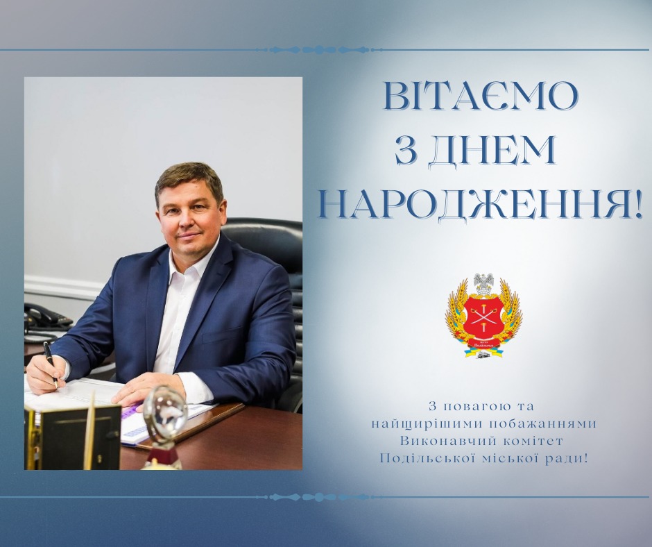 Виконавчий комітет Подільської міської ради надсилає найщиріші вітання з нагоди Дня народження Віталія Леонідовича Драгомарецького!