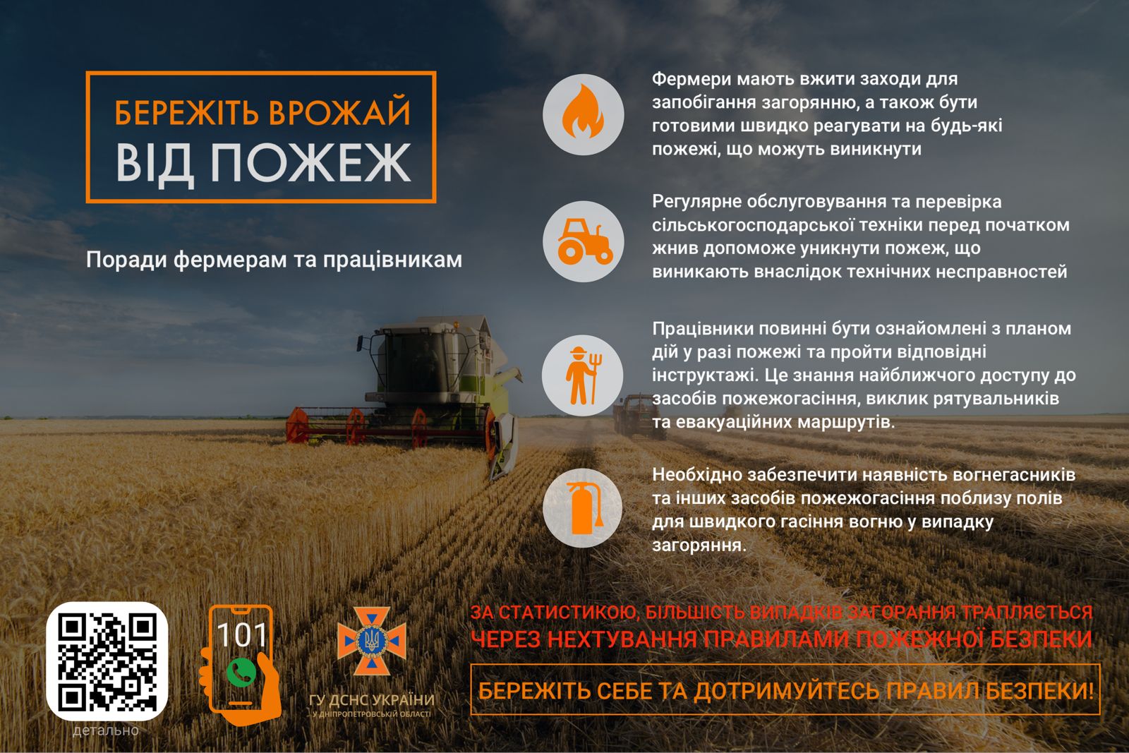 1. наказами керівників об’єктів, задіяних у збиранні та зберіганні сільгосппродукції, призначити відповідальних осіб за пожежну безпеку, яким доручити здійснення контролю за протипожежним станом, справністю електроустановок, технологічного обладнання, вжити необхідних заходів для усунення недоліків; 2. забезпечити придбання необхідної кількості сертифікованих вогнегасників та іскрогасників для облаштування ними зерно та сіносховищ, зерно токів, автотранспортної, хлібозбиральної та іншої, задіяної під час жнив техніки; 3. перевірити технічний стан пожежної та пристосованої для пожежогасіння техніки, вжити заходів щодо її комплектування сертифікованим пожежно-технічним обладнанням та організувати цілодобове чергування водіїв на ній; 4. вирішити питання забезпечення цілодобової охорони, у тому числі об’їждчиками хлібних масивів, місць зберігання грубих кормів; 5. переглянути склад протипожежних формувань (добровільних пожежних команд, добровільних пожежних дружин), забезпечити виконання передбачених законодавством соціальних питань, у тому числі обов’язкового особистого страхування членів пожежних формувань; 6. забезпечити розміщення біля хлібних полів, у місцях їх прилягання до шляхів, лісових масивів, залізниць, а також у місцях зберігання і переробки сільгосппродукції плакатів і знаків протипожежної безпеки; 7. хлібні поля в місцях прилягання їх до лісових та торф’яних масивів, степової смуги, автомобільних шляхів та залізниць, обкосити (із прибиранням скошеного) і оборати смугою не менше 4 м завширшки; 8. на хлібному масиві площею понад 25 га, з якого збирається врожай, встановлювати напоготові трактор з плугом на випадок пожежі; 9. перед косовицею хлібні масиви необхідно розбити на ділянки площею не більше 50Га, між ділянками зробити прокоси не менше 8 м завширшки, скошений хліб з прокосів необхідно негайно прибирати, посередині прокосів проорати смугу не менше 4 м завширшки; 10. обов‘язково попереджати за 3 доби власника електричних мереж про початок робіт по скошеною зернових культур в охоронній зоні ЛЕП 330-750 кв; 11. корпуси комбайнів оснастити заземлювальним металевим ланцюгом 10 см, який торкається землі; 12. виконати щільне з’єднання вихлопних труб з патрубками випускних колекторів та колекторів з блоком двигуна у збиральної техніки, регулярно перевіряти щільність з’єднань; 13. не допускати до роботи трактори, самохідні шасі, автомобілі та іншу збиральну техніку без капотів або з відкритими капотами (для запобігання потраплянню соломи на випускний колектор двигуна); 14. не допускати заправляння машин у нічний час у польових умовах, заправляння збиральної техніки у польових умовах здійснювати за межами поля (не ближче 30 м) паливозаправниками, коли заглушені двигуни; 15. ремонт збиральних машин і агрегатів, за потреби, виконувати не ближче 30 м від хлібних масивів та інших посівів. У разі тимчасового зберігання (стоянок) тракторів, комбайнів, автомобілів та інших самохідних машин у польових умовах необхідно розміщувати їх на очищених від стерні та сухої трави майданчиках, віддалених від скирт соломи, сіна, токів, хлібних масивів на відстані не менше 100 м., а від будинків – не менше 50 м. Ці майданчики оборати смугою не менше 4 м завширшки; 16. трактори, комбайни та інші самохідні машини, обладнані електричним пуском 