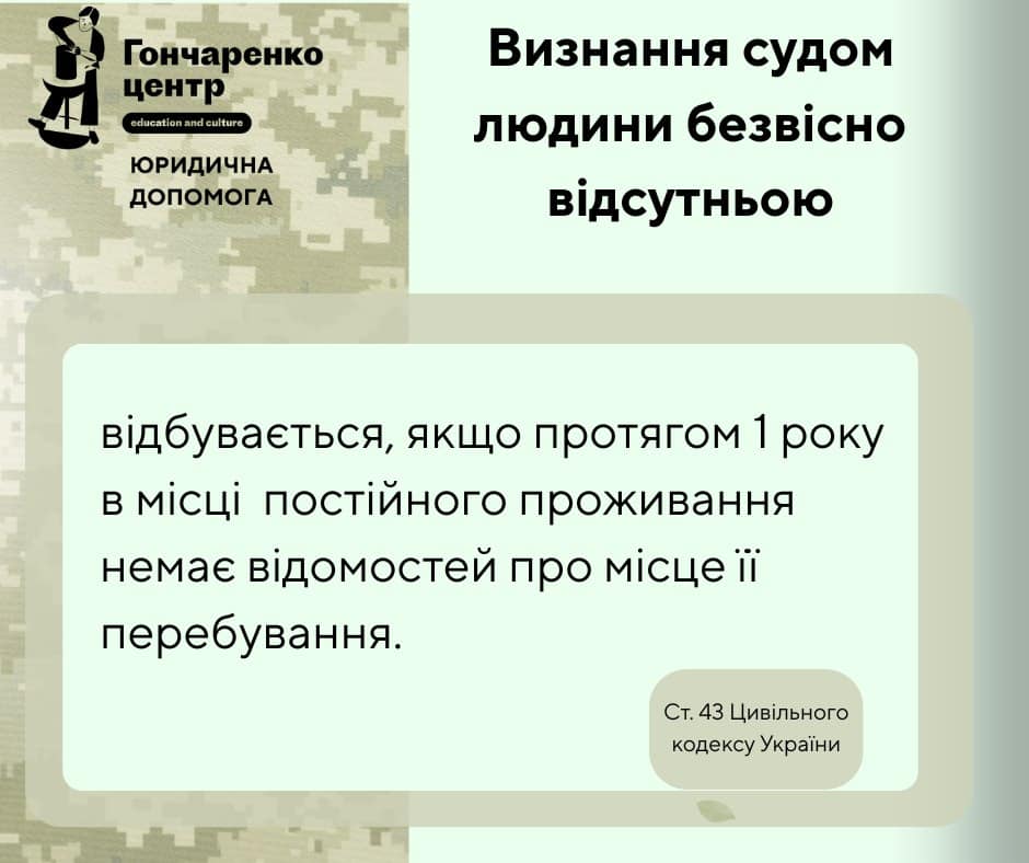 Для врегулювання важливих цивільних питань, що стосуються родин зниклих безвісти військових, часто виникає необхідність звернення до суду для визнання рідних померлими або безвісно відсутніми. Це особливо актуально у випадках оформлення спадщини, спрощеного розірвання шлюбу та припинення дії зобов’язань за дорученнями.
