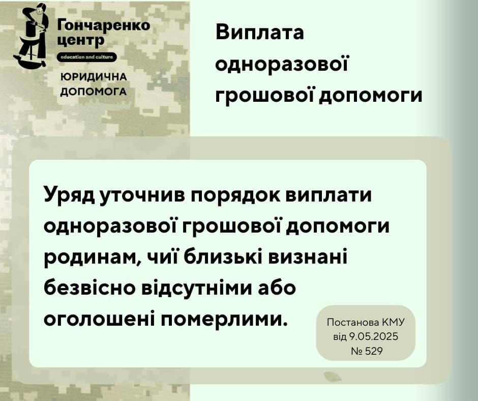 Уряд України вніс уточнення щодо виплати одноразової грошової допомоги сім’ям, члени яких брали безпосередню участь у бойових діях для забезпечення оборони України та були визнані безвісно відсутніми або оголошені померлими. Виплата ОГД є важливою підтримкою для цих родин.