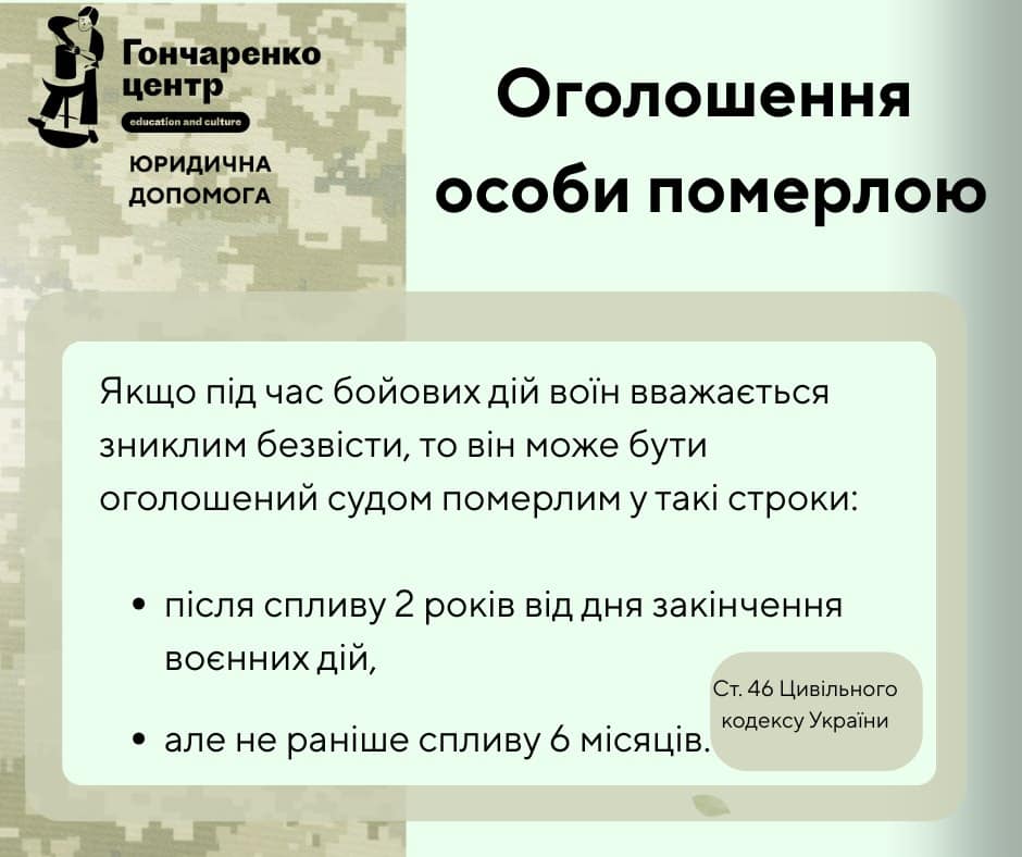 У ситуаціях, коли воїн зникає безвісти під час бойових дій, суд може оголосити його померлим за таких умов:
