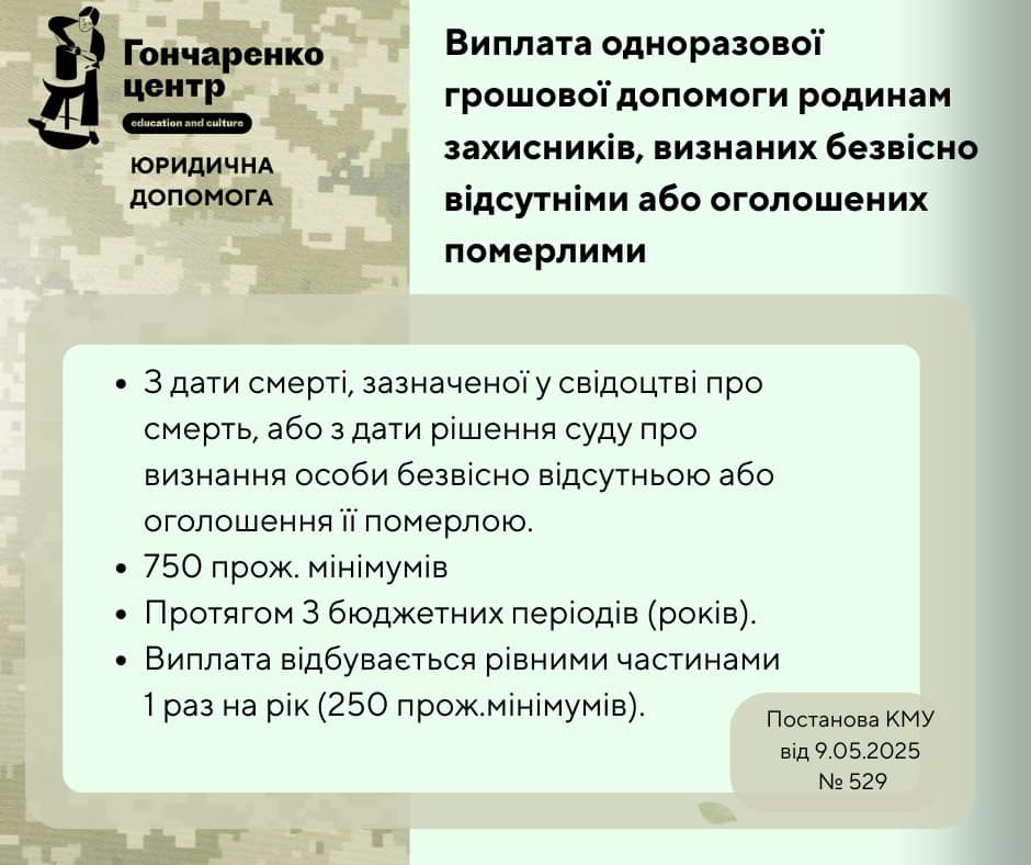 Юрист гарячої лінії Гончаренко центру Олександр Романов попереджає: якщо родина спочатку оформить виплату як за безвісно відсутнього (750 прожиткових мінімумів за 3 роки за постановою № 336), а пізніше з’ясується, що загибель мала ознаки, які підпадають під допомогу у розмірі 15 млн. грн. (постанова N 168), то можуть виникнути проблеми із її отриманням.