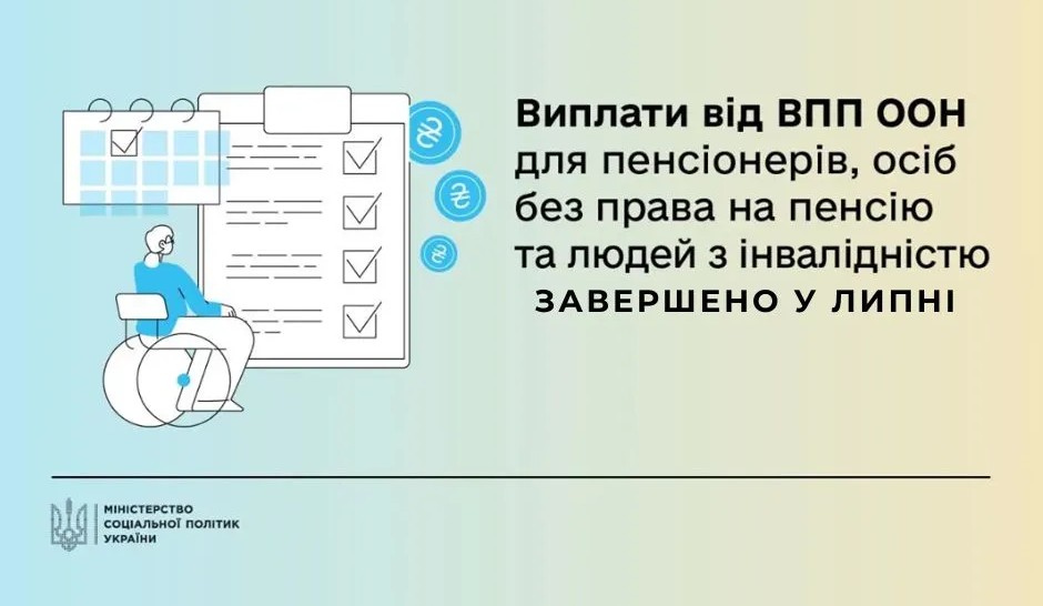 Всесвітня продовольча програма ООН (ВПП ООН) завершила виплати грошової допомоги для пенсіонерів, осіб без права на пенсію та осіб з інвалідністю у липні 2025 року. Ця ініціатива, започаткована у серпні 2023 року Міністерством соціальної політики, Пенсійним фондом України та ВПП ООН, мала на меті забезпечити максимальну синергію у наданні фінансової підтримки українцям від міжнародних гуманітарних організацій.