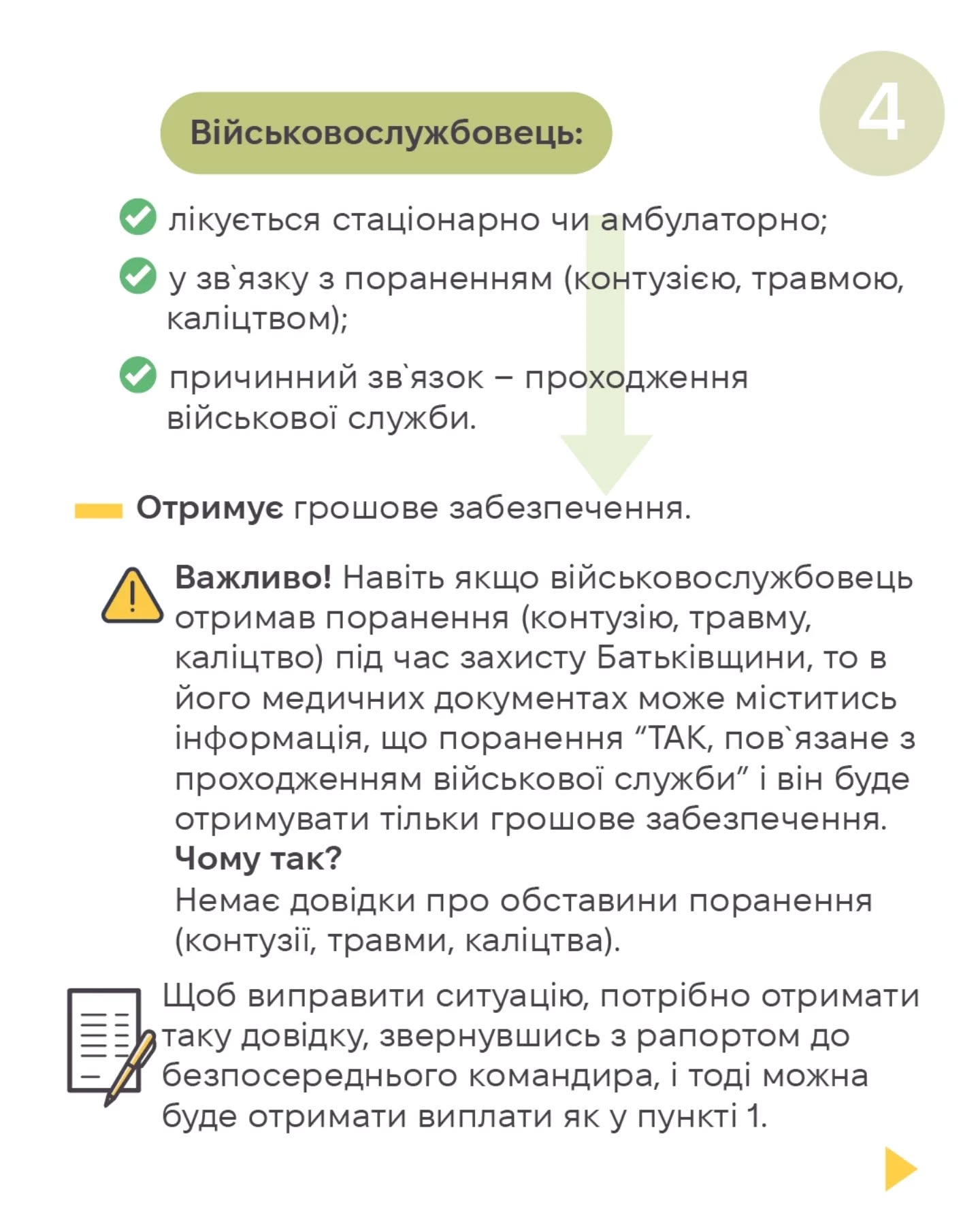 Часте запитання, яке надходить на нашу гарячу лінію, стосується виплат, які отримує військовослужбовець у період лікування. Ці фінансові гарантії залежать від багатьох чинників, зокрема від характеру ушкодження (поранення, контузія, травма, каліцтво) чи захворювання, причинного зв’язку з військовою службою, а також тривалості та форми лікування.