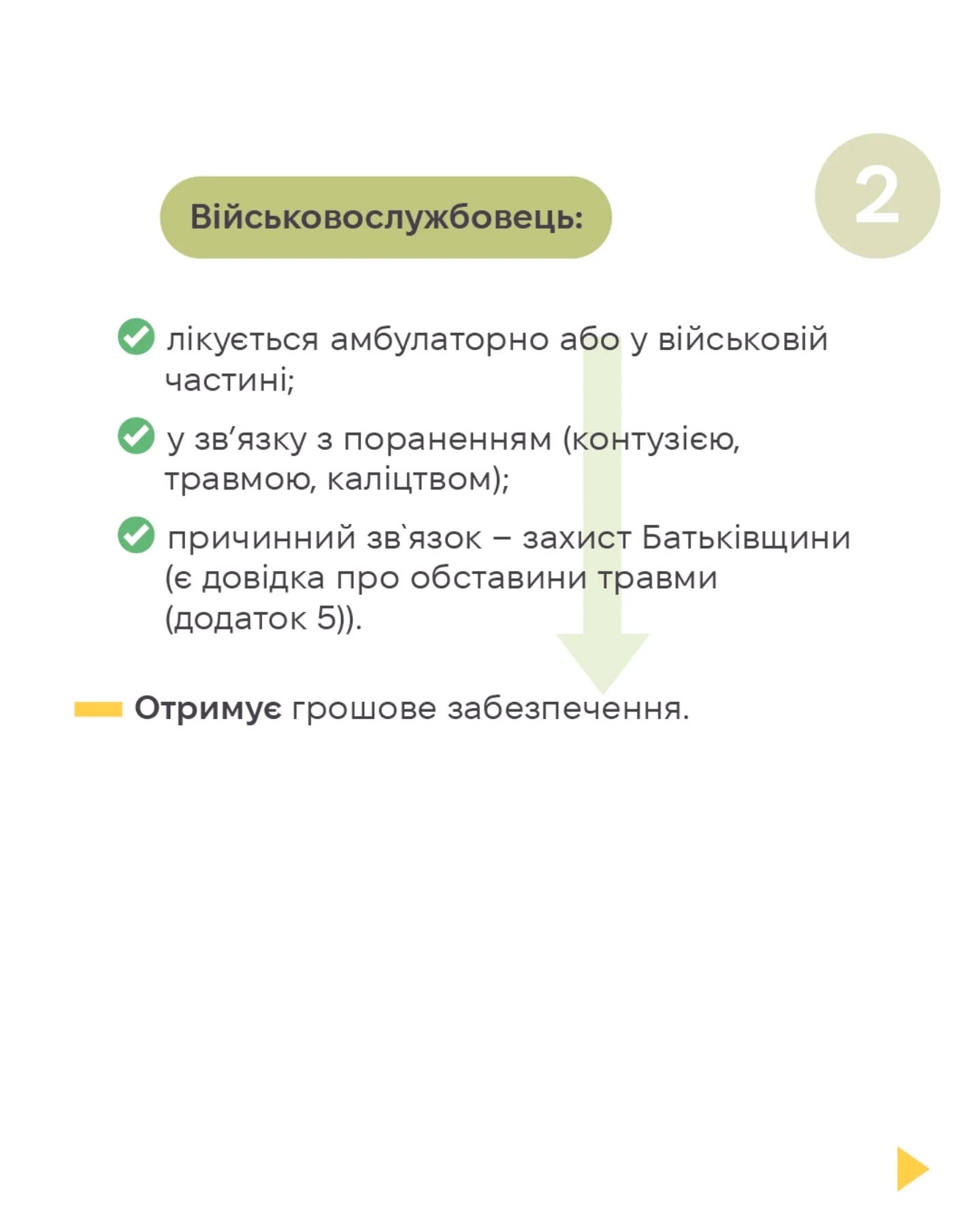 * **Форма лікування:** Чи проходить лікування військовий у військовому медичному закладі, цивільній лікарні, чи проходить реабілітацію вдома – це може мати значення для певних видів виплат.