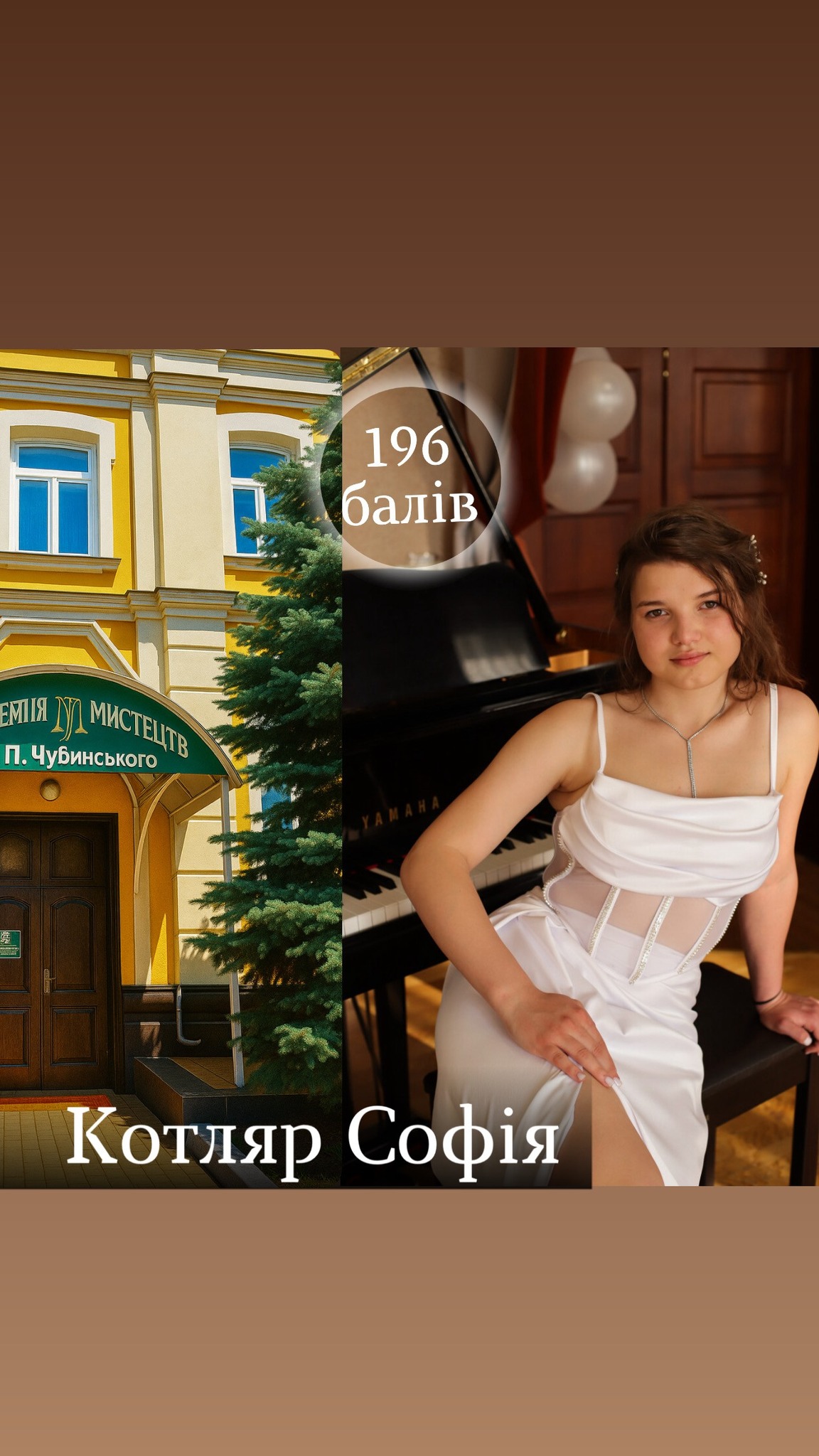 - Котляр Софія (196 балів), фортепіано — Академія мистецтв ім. П. Чубинського. Клас викладача: Полторацька Ліна Геннадіївна.