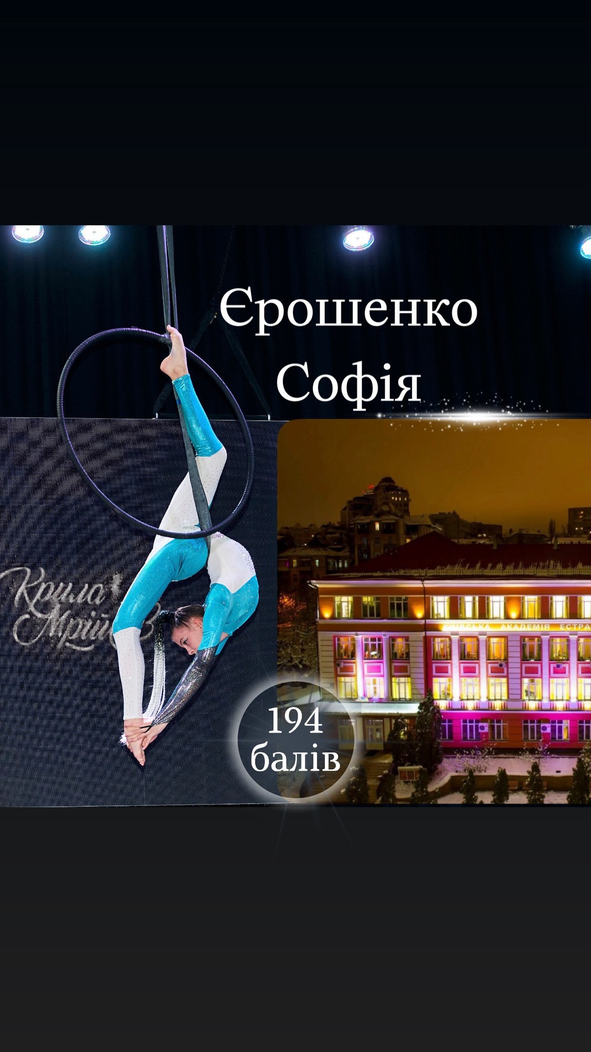 - Єрошенко Софія (194 бали), циркове мистецтво — Київська муніципальна академія естрадного та циркового мистецтв. Клас викладача: Кернер-Вернер Ірина Анатоліївна.