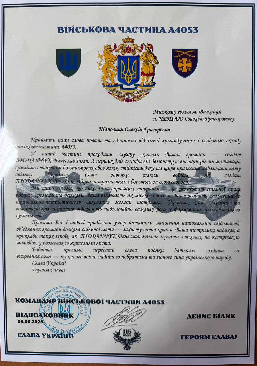 Висловлюємо щиру вдячність герою, жителю Вижницької громади, солдату Збройних Сил України Проданчуку В’ячеславу Іллічу за його віддану службу, вірність Батьківщині та гідне представлення нашої громади у військовій частині А4053. Його внесок у захист нашої країни неоціненний.