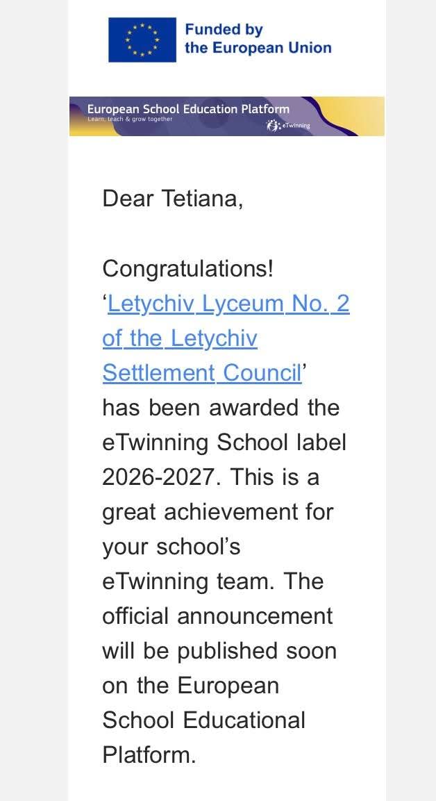 Приємна новина надійшла до нашої громади. Дружна освітянська родина Летичівського ліцею №2 Летичівської селищної ради (директор ІВАСЮК Галина) офіційно отримала почесну відзнаку eTwinning School Label 2026-2027.