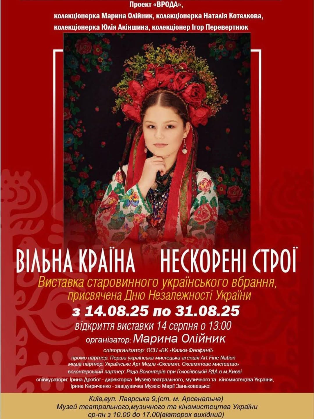 14 серпня у Музеї театрального, музичного і кіномистецтва України відкривається виставка «Вільна країна: нескорені строї» — понад 50 автентичних вбрань з усіх куточків України.