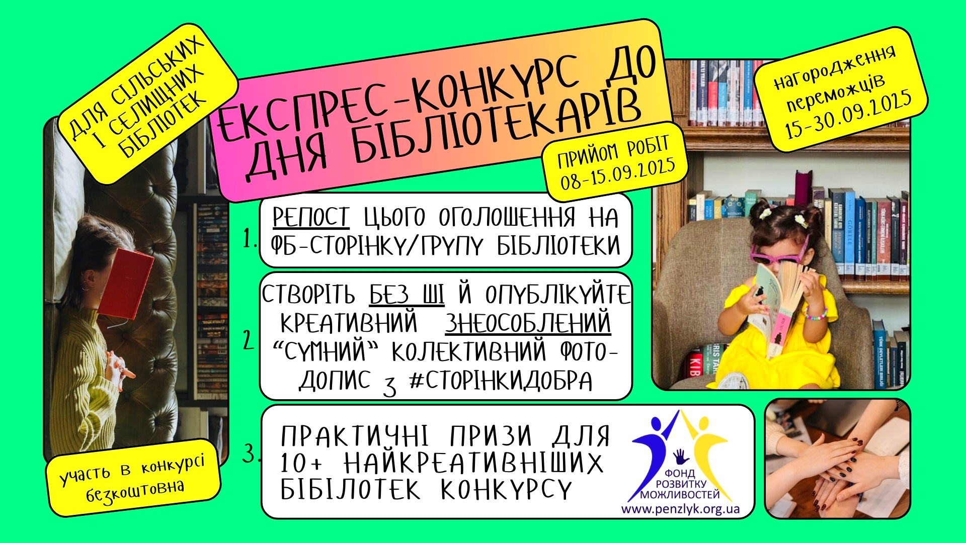 Цей експрес-конкурс креативних фото-текстових дописів до Дня бібліотекаря впроваджується громадською організацією “Фонд розвитку можливостей” за рахунок власних коштів, у межах міні-грантової програми “Сторінки добра”. 👑
