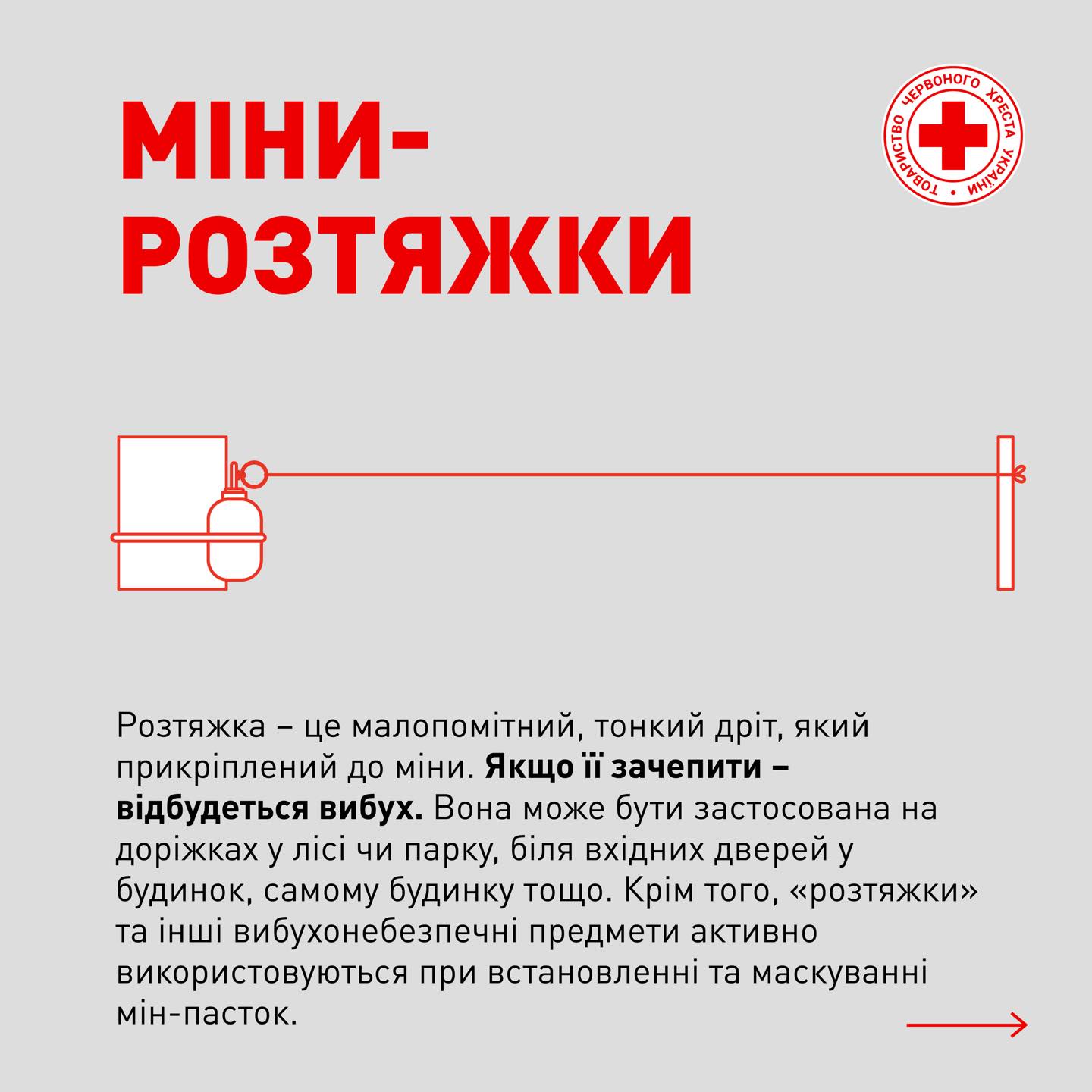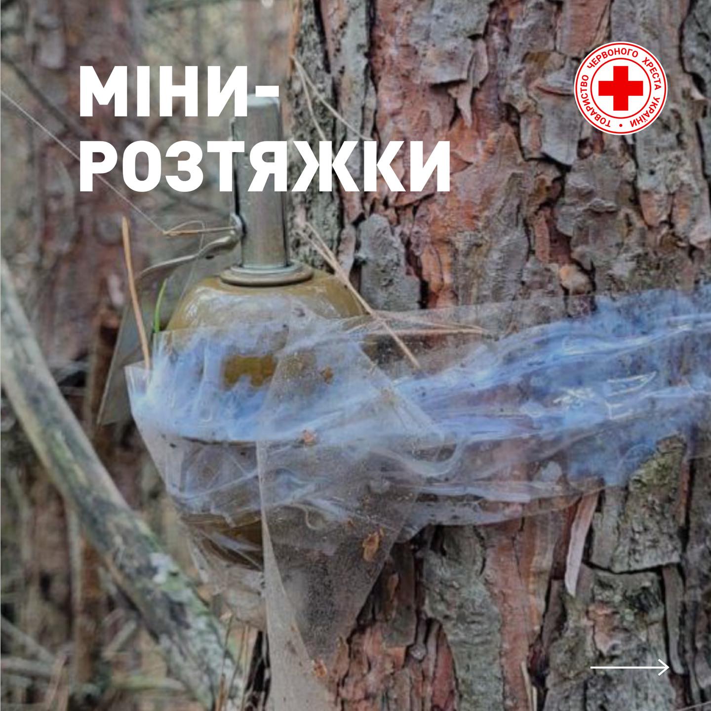 Міна-розтяжка зазвичай має вигляд тонкого дроту, який важко помітити. Проте, якщо його зачепити, це призведе до вибуху. Такі міни можуть бути встановлені на лісових стежках, у парках, біля вхідних дверей будинків або навіть у самих будинках. Крім того, «розтяжки» та інші вибухонебезпечні предмети часто зустрічаються поблизу місць бойових дій або військових позицій. Тому будьте особливо уважні в таких районах.
