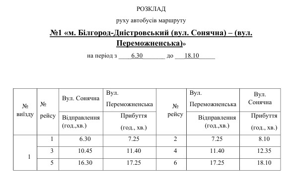 🚌 Зміни у розкладі руху автобусів соціального маршруту в Білгород-Дністровському! Напередодні нового навчального року, враховуючи службову записку Управління освіти міської ради, виконавчий комітет затвердив важливі зміни в паспорт автобусного маршруту регулярних спеціальних перевезень №1 по місту. Ці оновлення стосуються маршруту “вул. Сонячна – вул. Переможненська”.