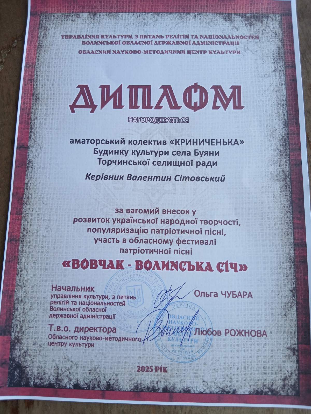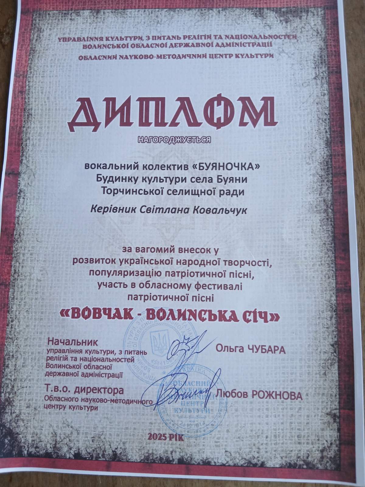 – вокальний колектив «Буяночка» будинку культури села Буяни (керівник Світлана КОВАЛЬЧУК),