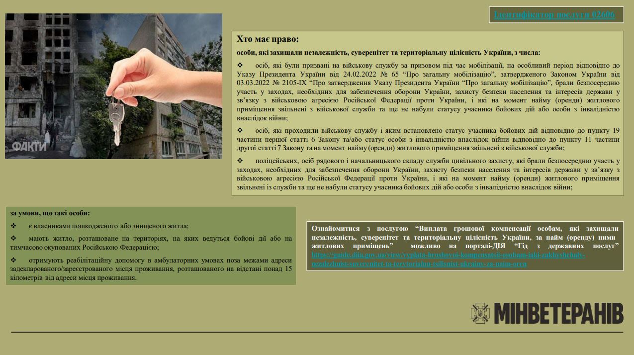 Ознайомитися з послугою «Виплата грошової компенсації особам, які захищали незалежність, суверенітет та територіальну цілісність України, за найм (оренду) ними житлових приміщень» можливо на порталі ДІЯ «Гід з державних послуг»: https://guide.diia.gov.ua/view/vyplata-hroshovoi-kompensatsii-osobam-iaki-zakhyshchaly-nezalezhnist-suverenitet-ta-terytorialnu-tsilisnist-ukrainy-za-naim-oren