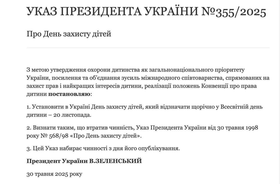 Президент України Володимир Зеленський підписав указ, який вносить важливі зміни до календаря свят. Відповідно до Указу Президента України №355/2025 від 30 травня 2025 року, День захисту дітей в Україні буде відзначатися в іншу дату. Це рішення прийнято з метою посилення уваги до захисту прав дитини та гармонізації з міжнародними стандартами.