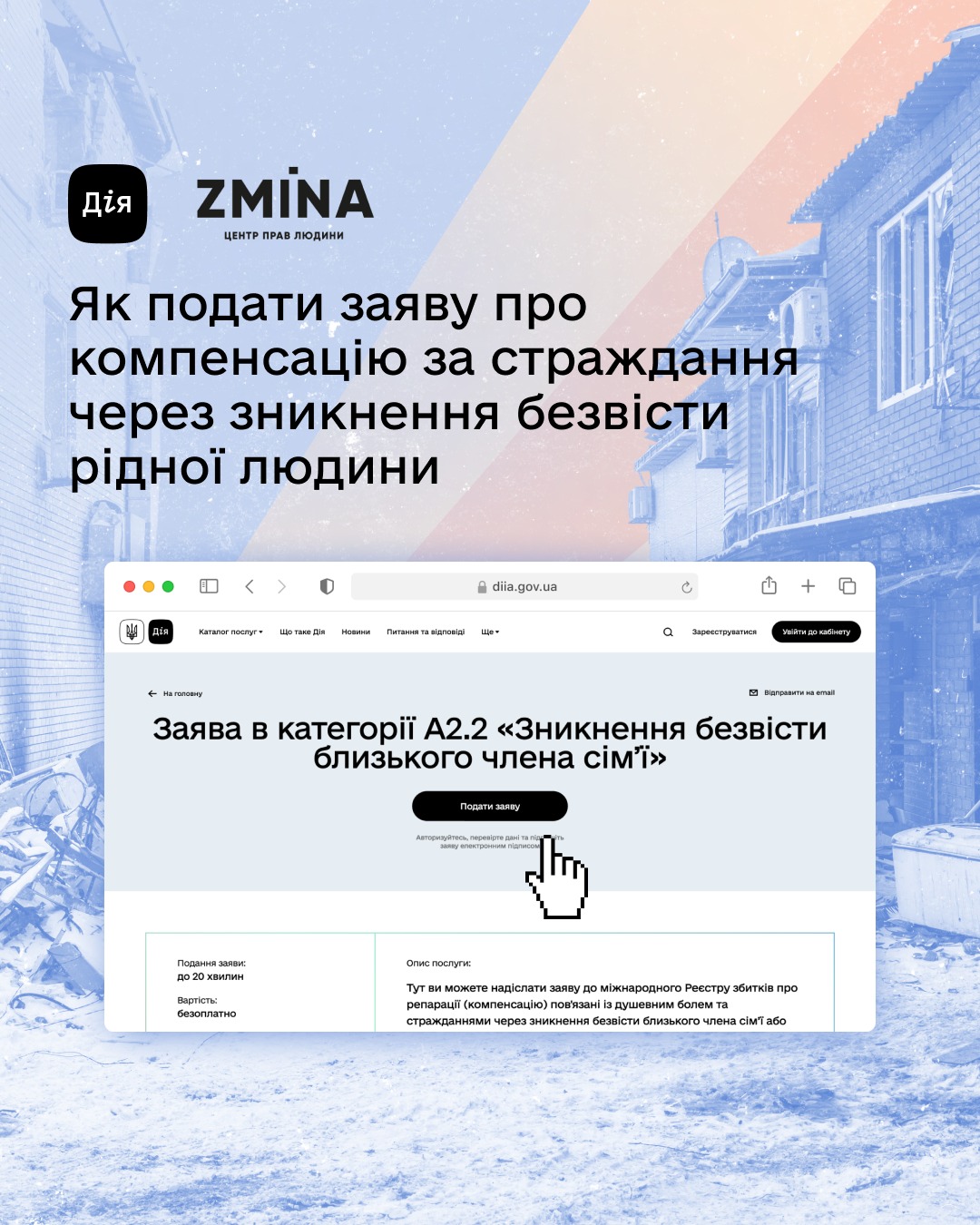 Подати заяву про відшкодування душевного болю та страждань тепер можна на порталі Дія. Кожне подане повідомлення є важливим внеском у майбутні репарації. Ваші свідчення – це фундамент для справедливості.