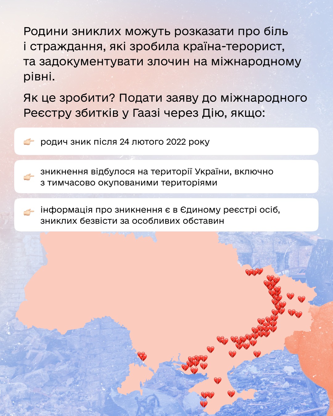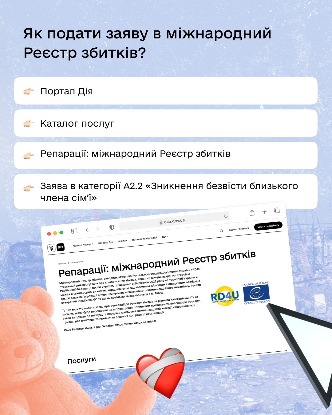 Не залишайте безкарним злочини, вчинені проти вас та ваших близьких. Міжнародний Реєстр збитків та портал Дія – ваші інструменти в боротьбі за справедливість. Зверніться за допомогою, щоб отримати заслужене відшкодування.