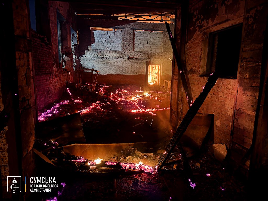 Уночі ворог здійснив масовану атаку на цивільну інфраструктуру в Лебединській громаді, що на Сумщині. За попередніми даними, зафіксовано влучання 12-ма БпЛА, що призвело до значних руйнувань та пожежі.