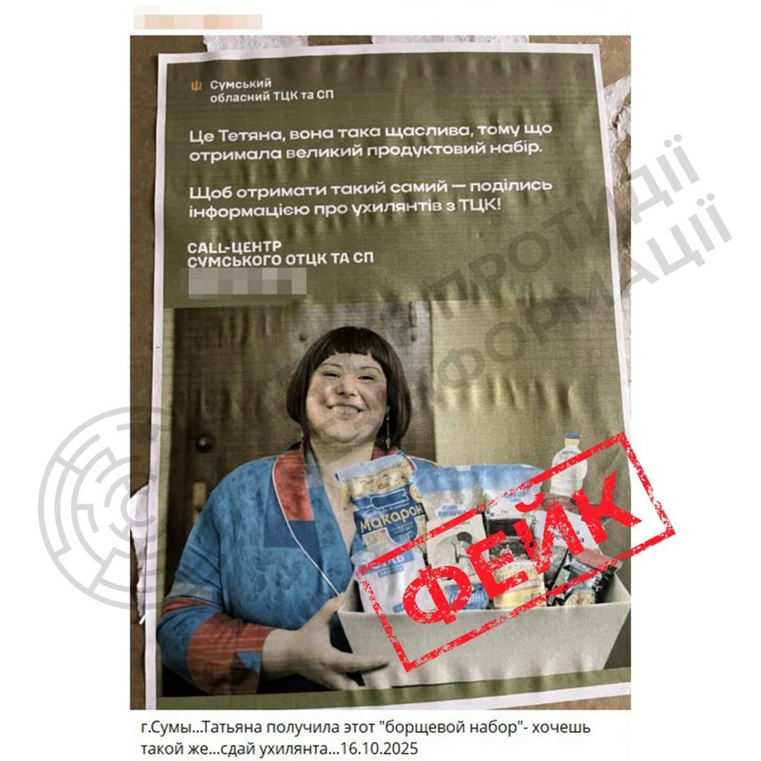 На фейковому зображенні, яке активно розповсюджується, присутня жінка з продуктами та текстом: «Це Тетяна, вона така щаслива, бо отримала великий продуктовий набір. Щоб отримати такий самий, поділися інформацією про ухилянтів з ТЦК».