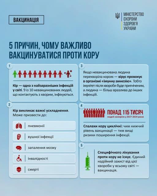 2️⃣ Спалахи кору мають циклічний характер. Чим нижчий рівень вакцинації в популяції, тим вищі ризики швидкого поширення інфекції. Під час епідемії кору в Україні у 2017–2019 роках захворіло понад 115 тисяч людей, а 41 особа померла, що підкреслює небезпеку недостатнього охоплення щепленням.