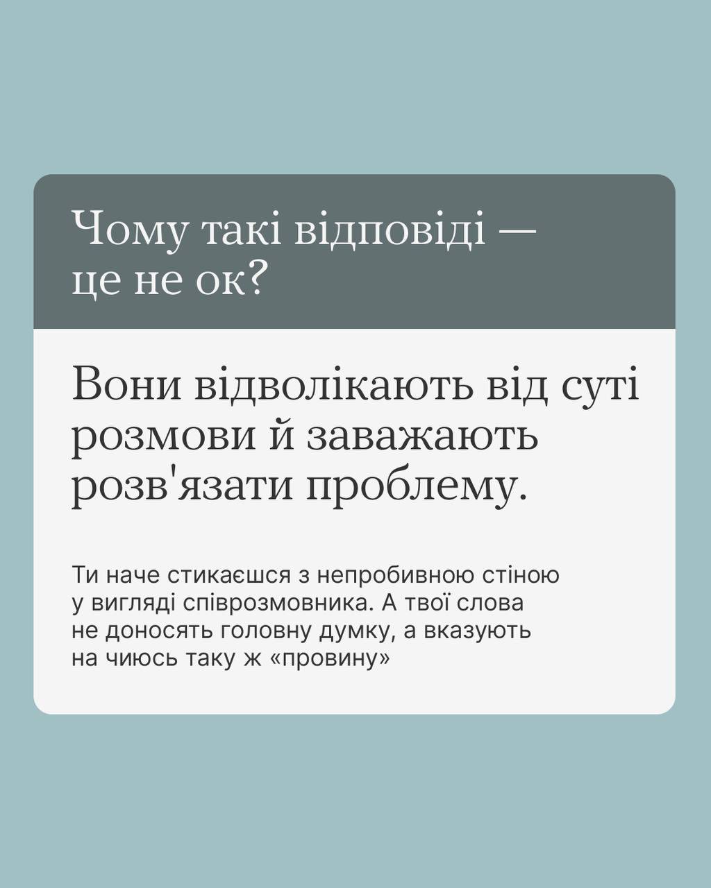 * **Ухилення від теми:** Людина уникає відповіді по суті, перемикаючи увагу на недоліки співрозмовника.
