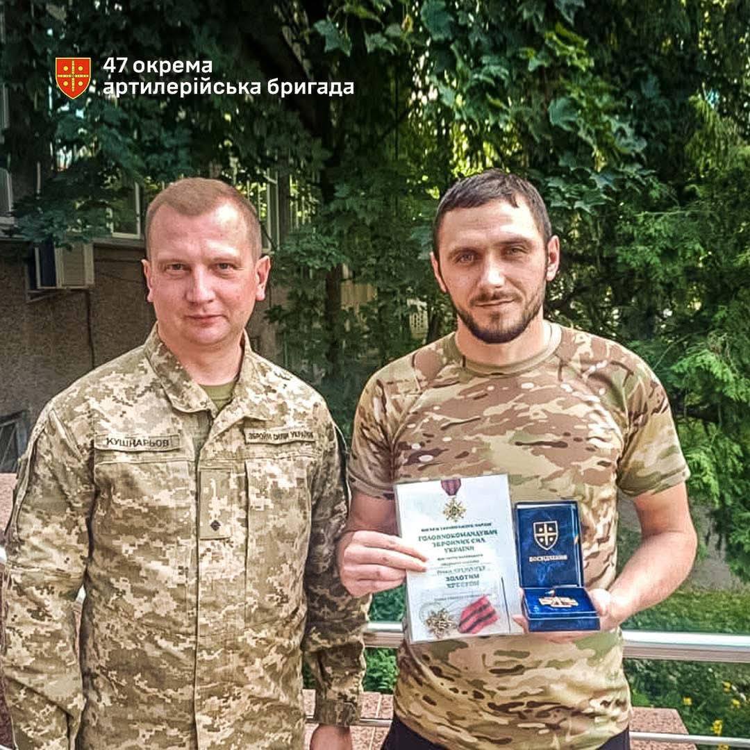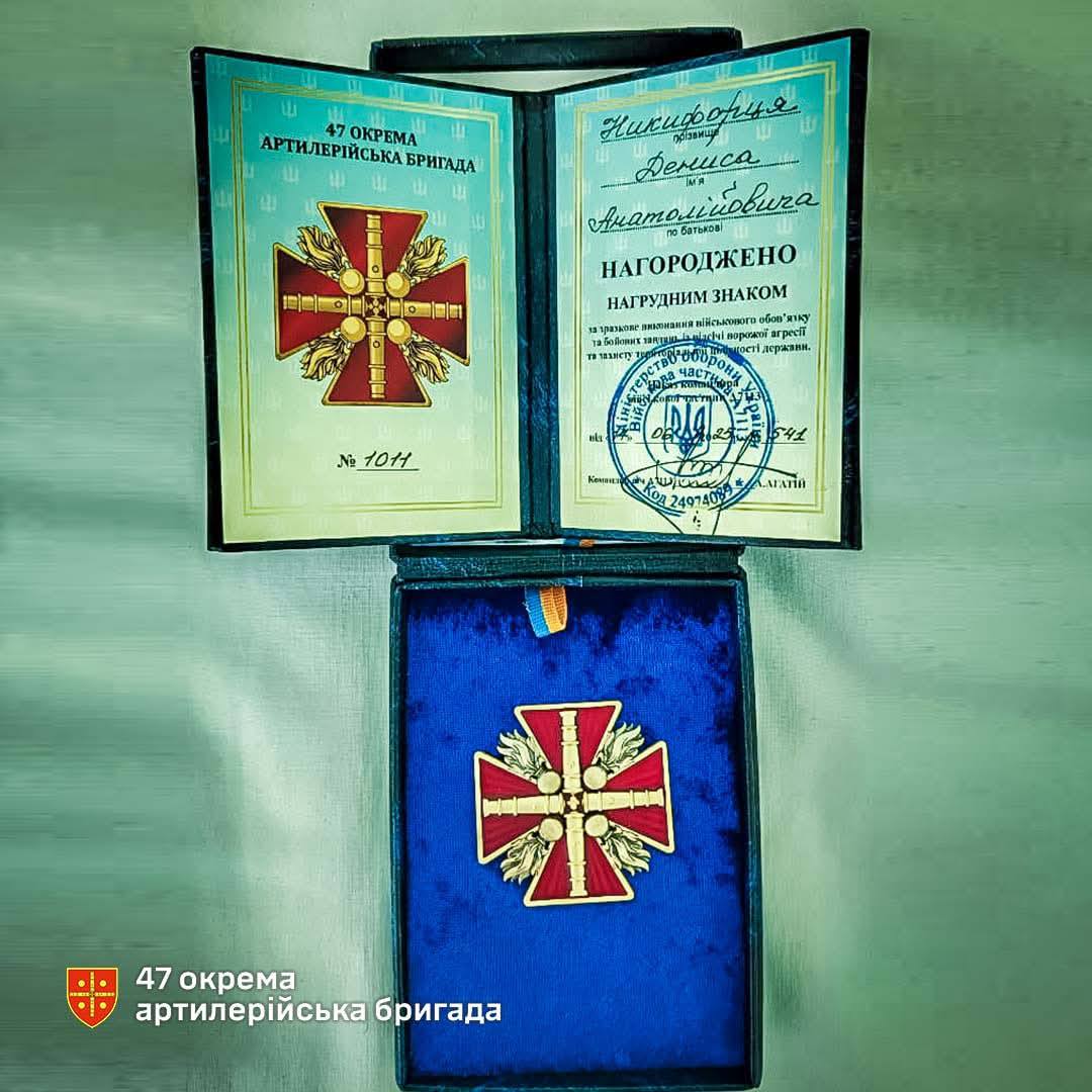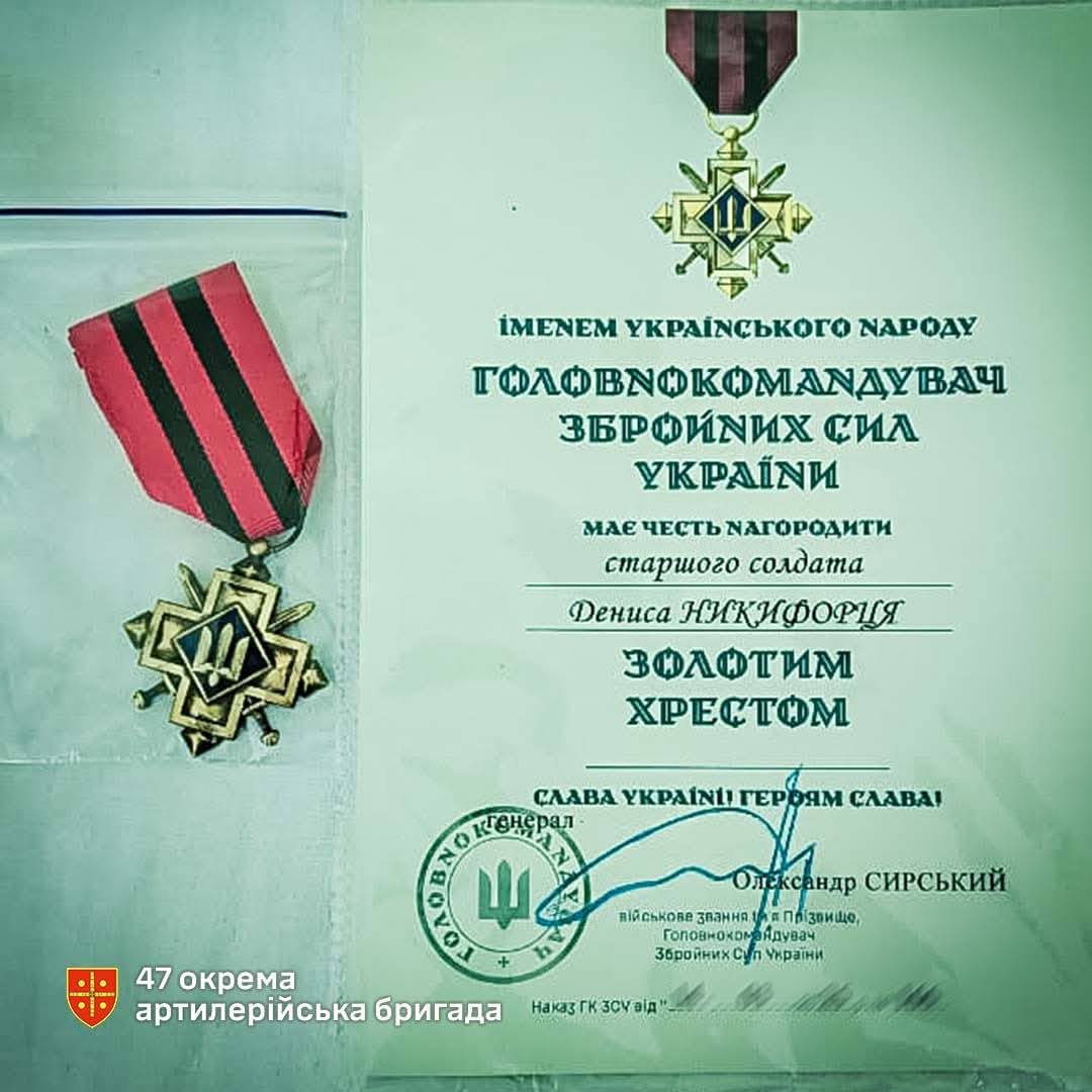 Старший солдат Денис Никифорець із села Стерче отримав відзнаку «Золотий хрест» від Головнокомандувача ЗСУ, а також нагрудний знак 47-ї окремої артилерійської бригади.