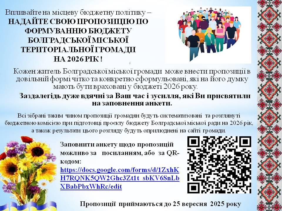 Активно долучайтеся до формування бюджету Болградської міської територіальної громади на 2026 рік! Ваші пропозиції мають значення.