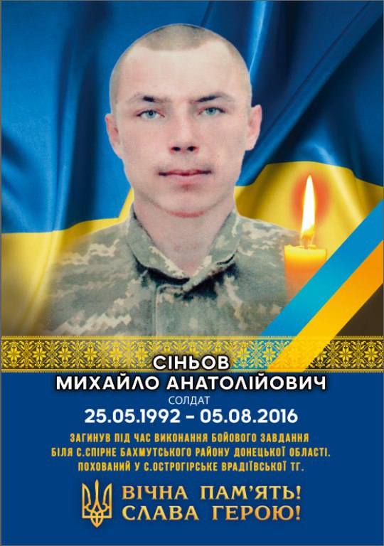 5 серпня 2016року загинув наш земляк, учасник АТО, солдат, СІНЬОВ Михайло Анатолійович, під час виконання бойового завдання біля населеного пункту Спірне Бахмутського району Донецької області.