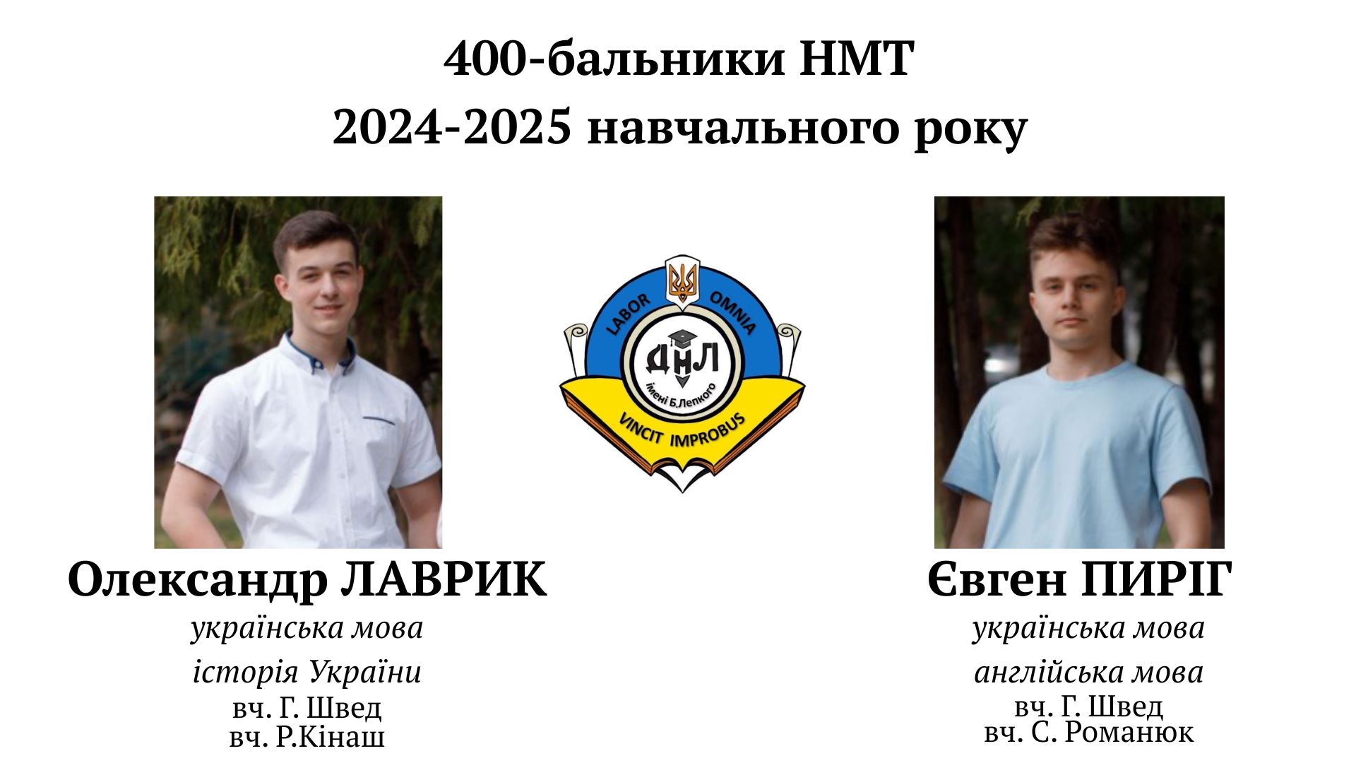 Ще вищі результати показали двоє випускників Наукового ліцею імені Богдана Лепкого, які набрали 400 балів (по 200 з двох предметів), а випускник Стебницького ліцею №7 – набрав максимально можливі 600 балів (по 200 балів з усіх трьох предметів на тестуванні).