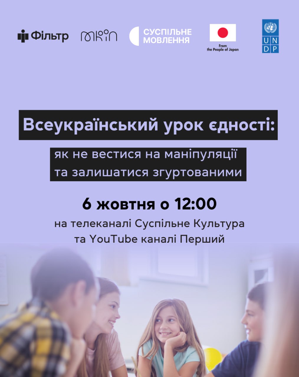 Національний проєкт «Фільтр» у співпраці з Суспільним транслюватиме Всеукраїнський урок єдності для учнів 5-11 класів, батьків та вчителів. Трансляція уроку єдності відбудеться на телеканалі Суспільне Культура та YouTube-каналі Перший.